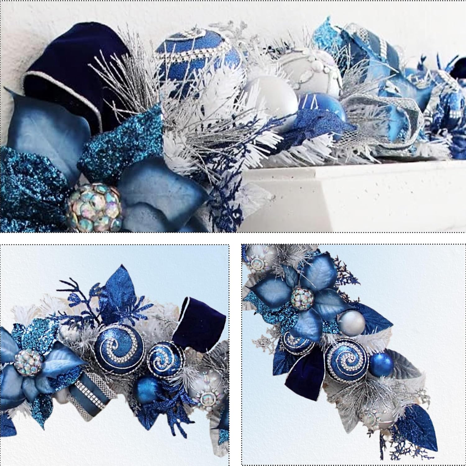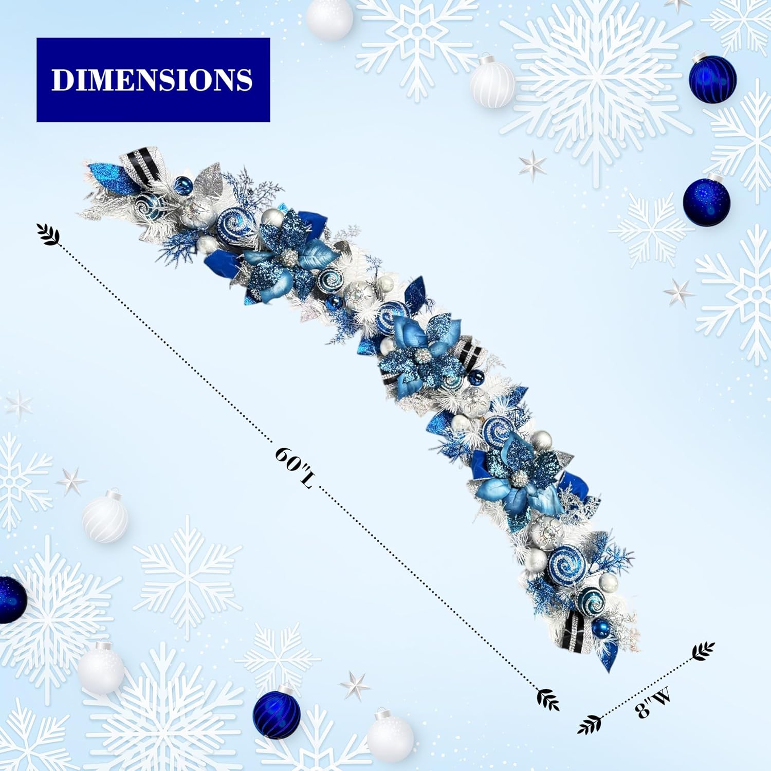 • 5 ft Christmas Garland For Mantle Unlit Garland For Stairs Railing, Banister, Staircase, Fireplace, For Table No Light, Garland Decor Frosted Red Poinsettia Holiday Tree (Lux Blue Silver)