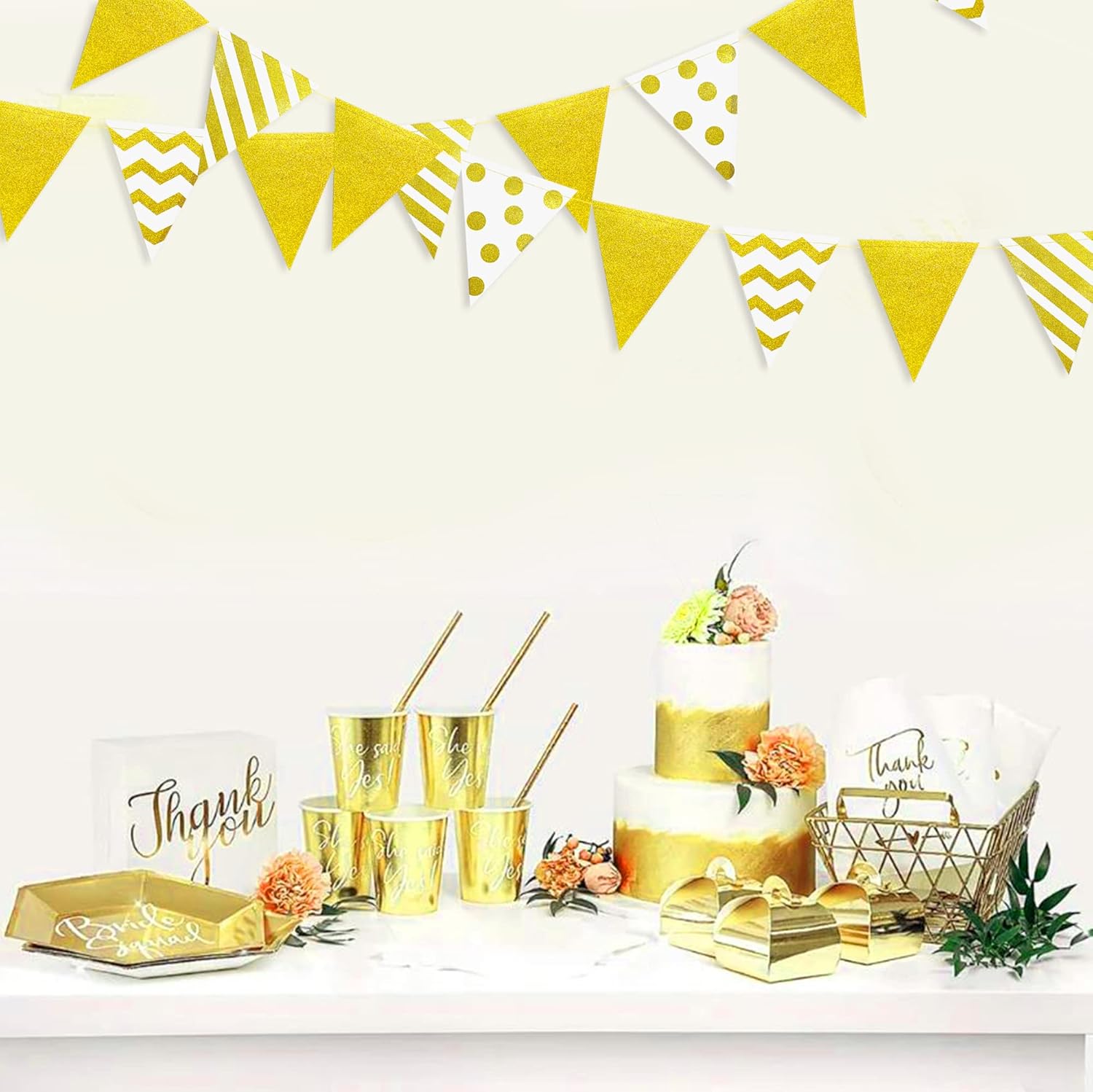 • Special design: This white and gold pennant banner is alternately composed of 3 patterns ( gold stripe, gold wave, gold polka dots) with glitter gold paper and white cardstock. The flag is neatly cropped and is the perfect choice for a white and gold theme background decorations.