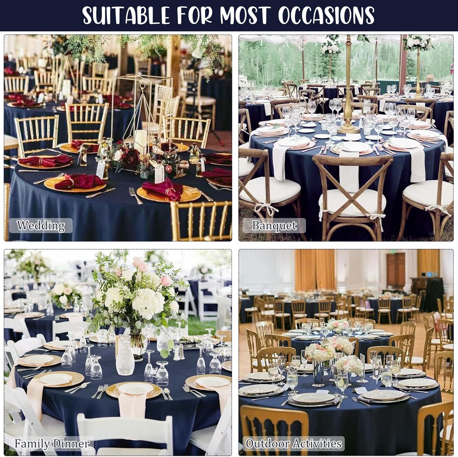 • Package Include: you will get 8 pieces navy blue polyester round tablecloth, enough quantity is suitable for wedding banquets and various parties, the size of each tablecloth is approximately 120 inches / 304 cm, which is large enough to cover 48" to 72" round tables, classic in color and exquisite in design, the solid color makes them suitable for various occasions, instantly heightening the elegance of your table.