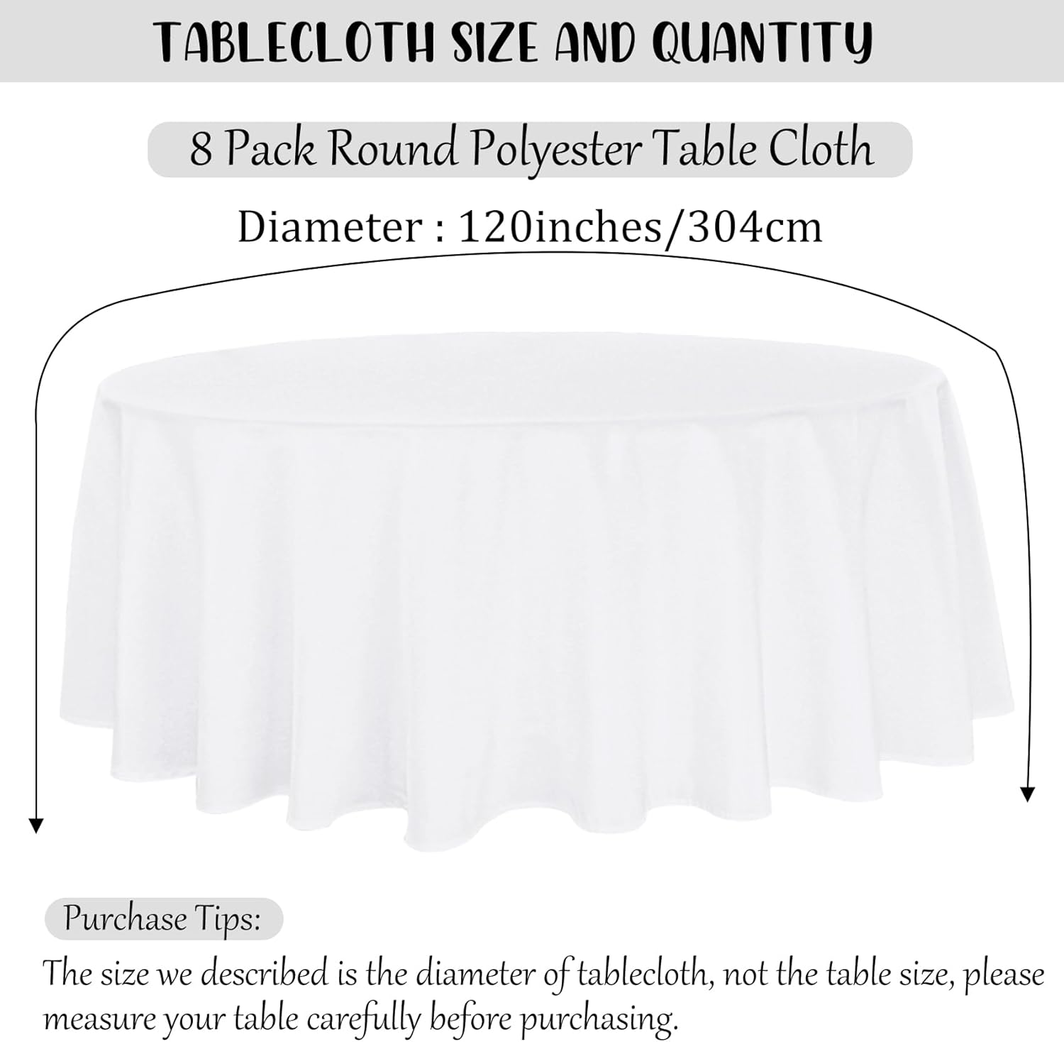 • Package Include: you will get 8 pieces white polyester round tablecloth, enough quantity is suitable for wedding banquets and various parties, the size of each tablecloth is approximately 120 inches / 304 cm, which is large enough to cover 48" to 72" round tables, classic in color and exquisite in design, the solid color makes them suitable for various occasions, instantly heightening the elegance of your table.
