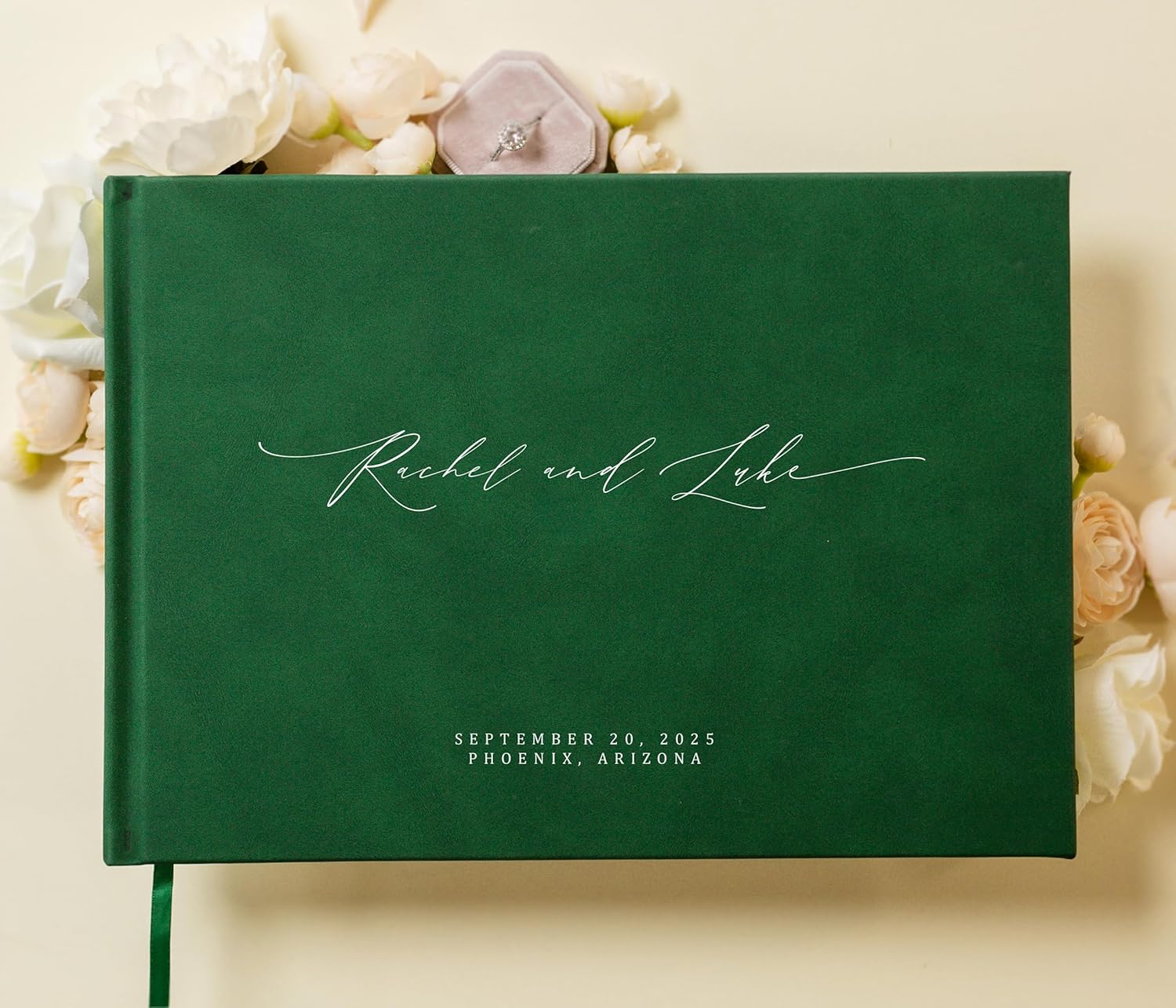 MUUJEE Personalized Guestbook in Emerald - Premium Custom Modern Guest Book for Wedding Reception, Birthday Party or Events w/Bookmark Blank Pages for Signing 11.5 x 8.5 inches