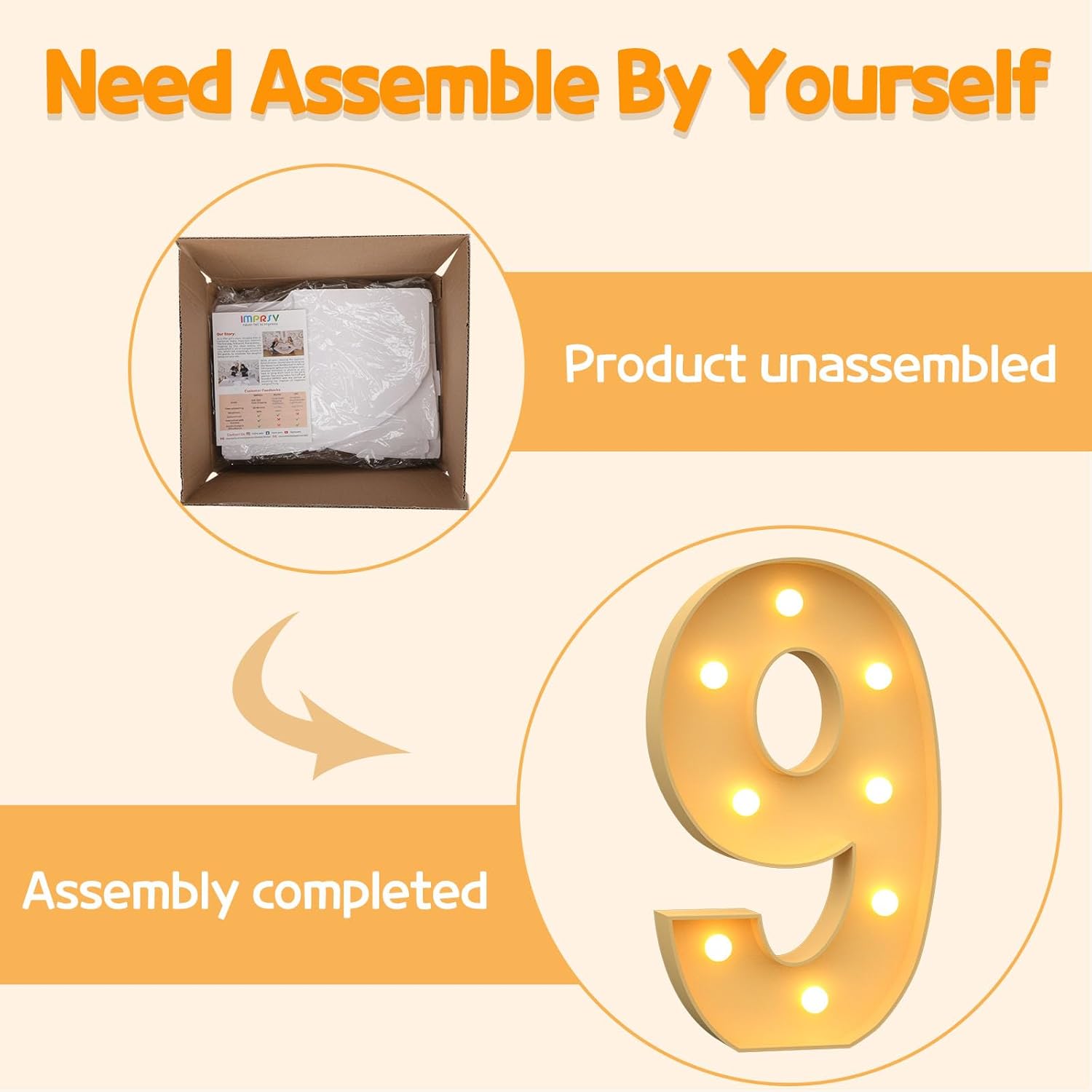 • Assembly Required: Our large marquee numbers is made from foam board and easy to assemble with our splicing mode. Just follow the numbered instructions to align and insert the bottom plate, and reinforce it with a hot glue gun. Then, you're done!