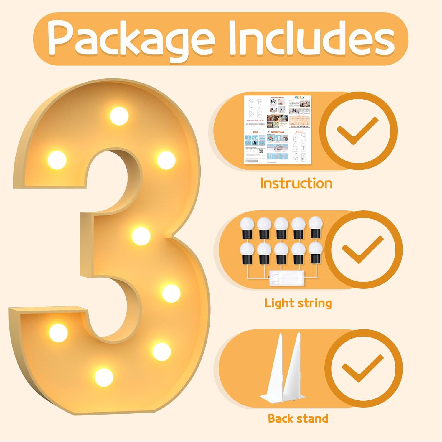 Marquee Numbers 3 Feet Tall Large Light Up Numbers 3th 13th 30th Three RexBirthday Decorations Girl Boy Big Yellow Light Outdoor Anniversary Decorations Balloon Arch Kit Party Backdrop 3