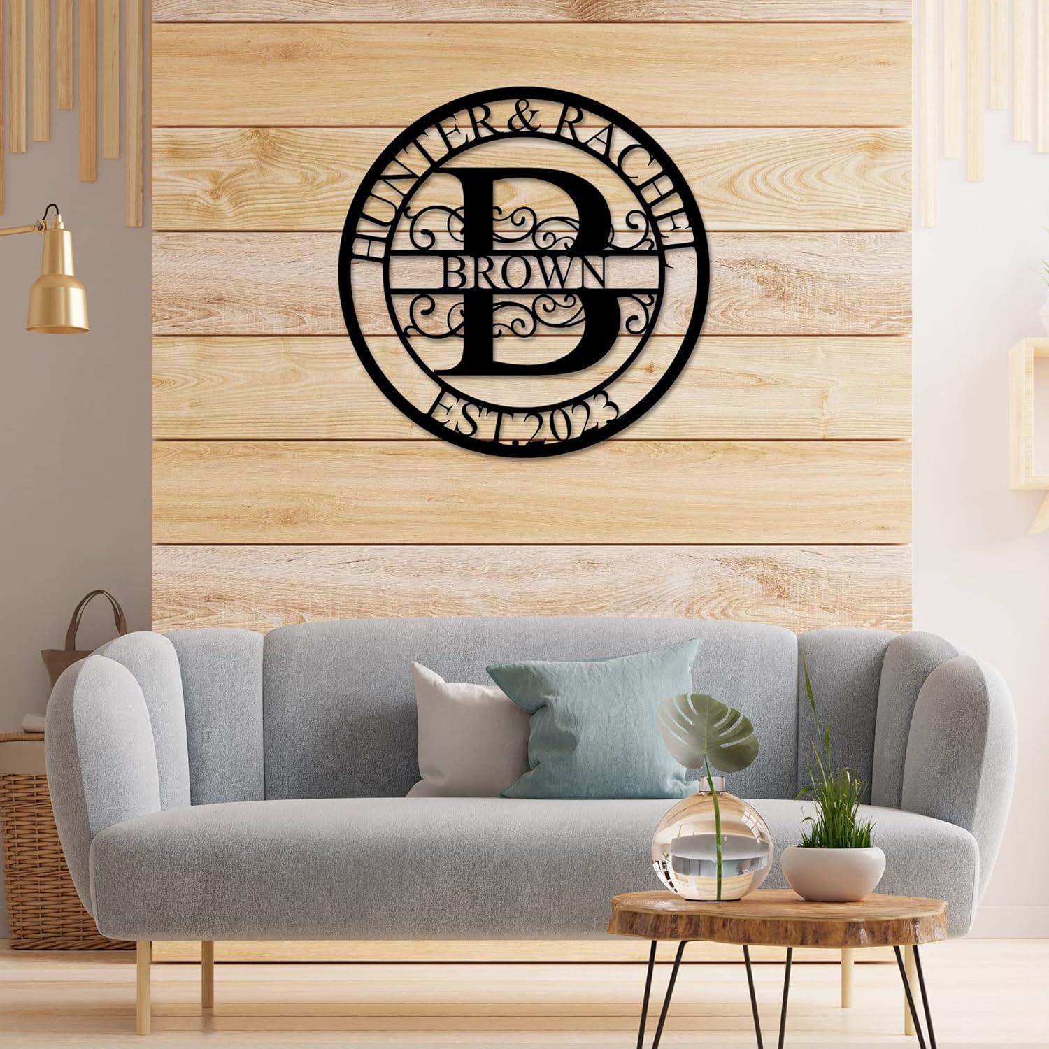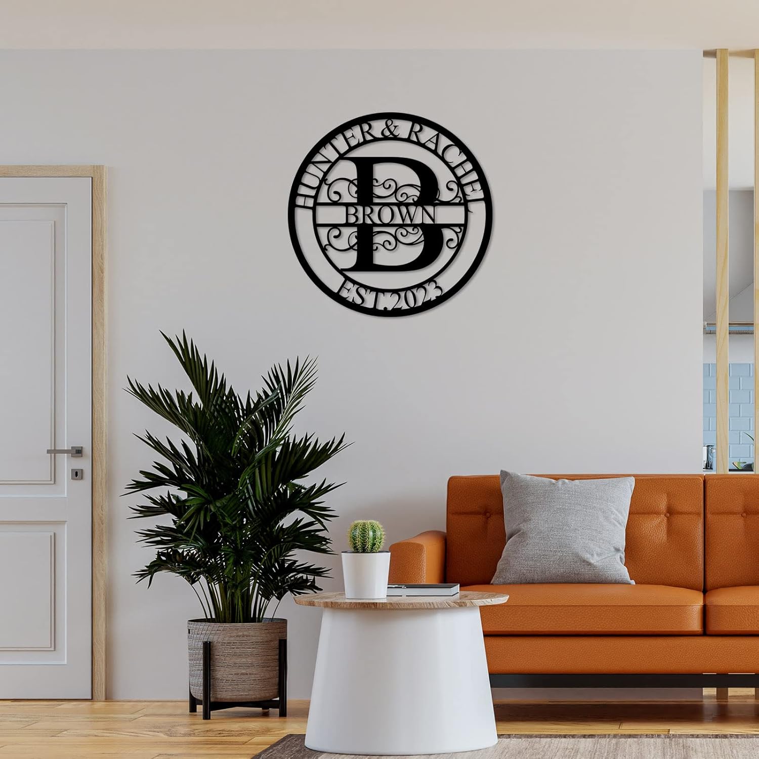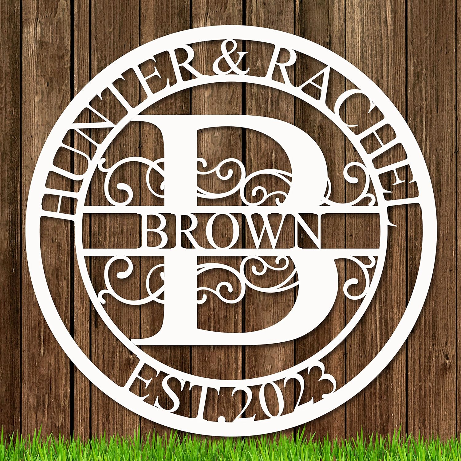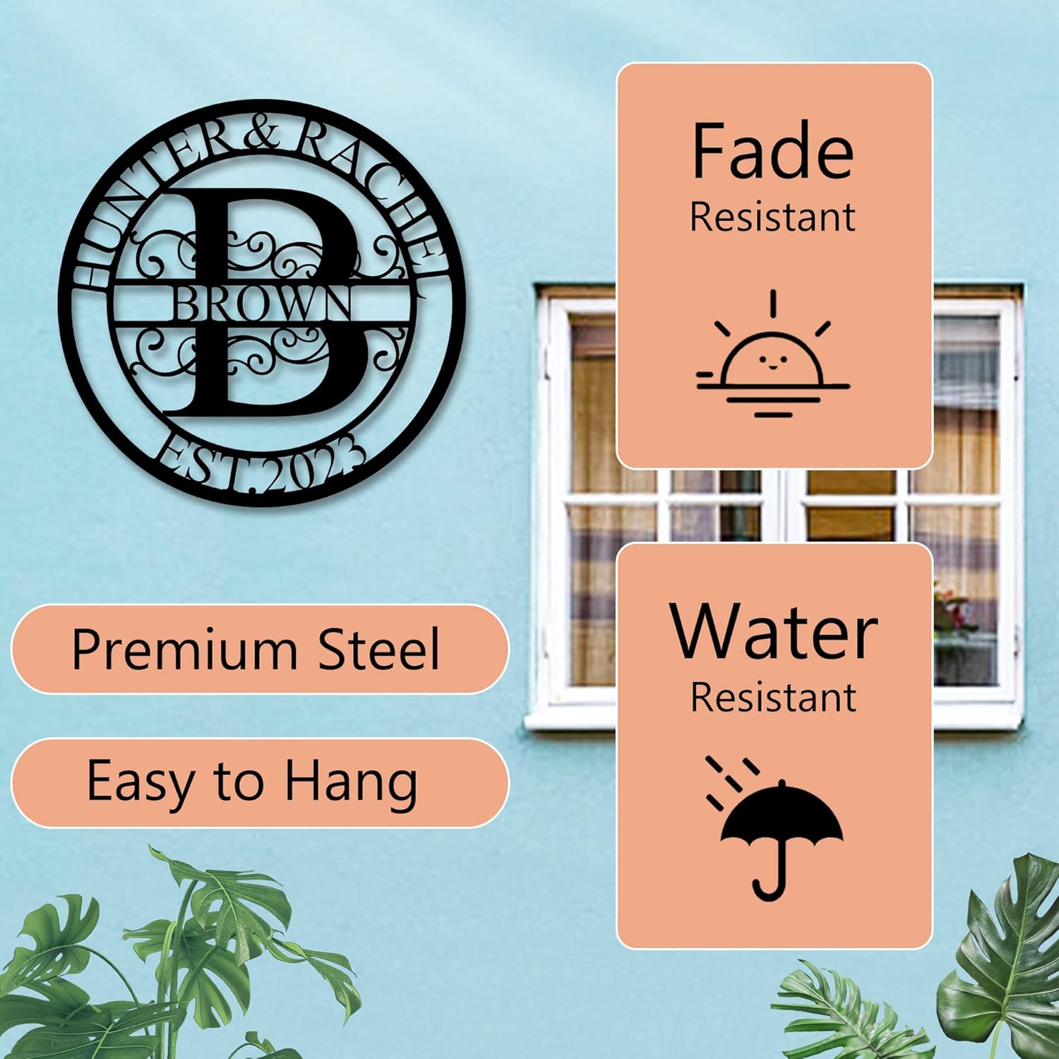 • ⭕ UNIQUE DESIGN: This custom metal name sign design is very unique. A simple circular design with the initials of the last name for the background. Add a family name and couple's name with the established date, to create a perfect family sign.