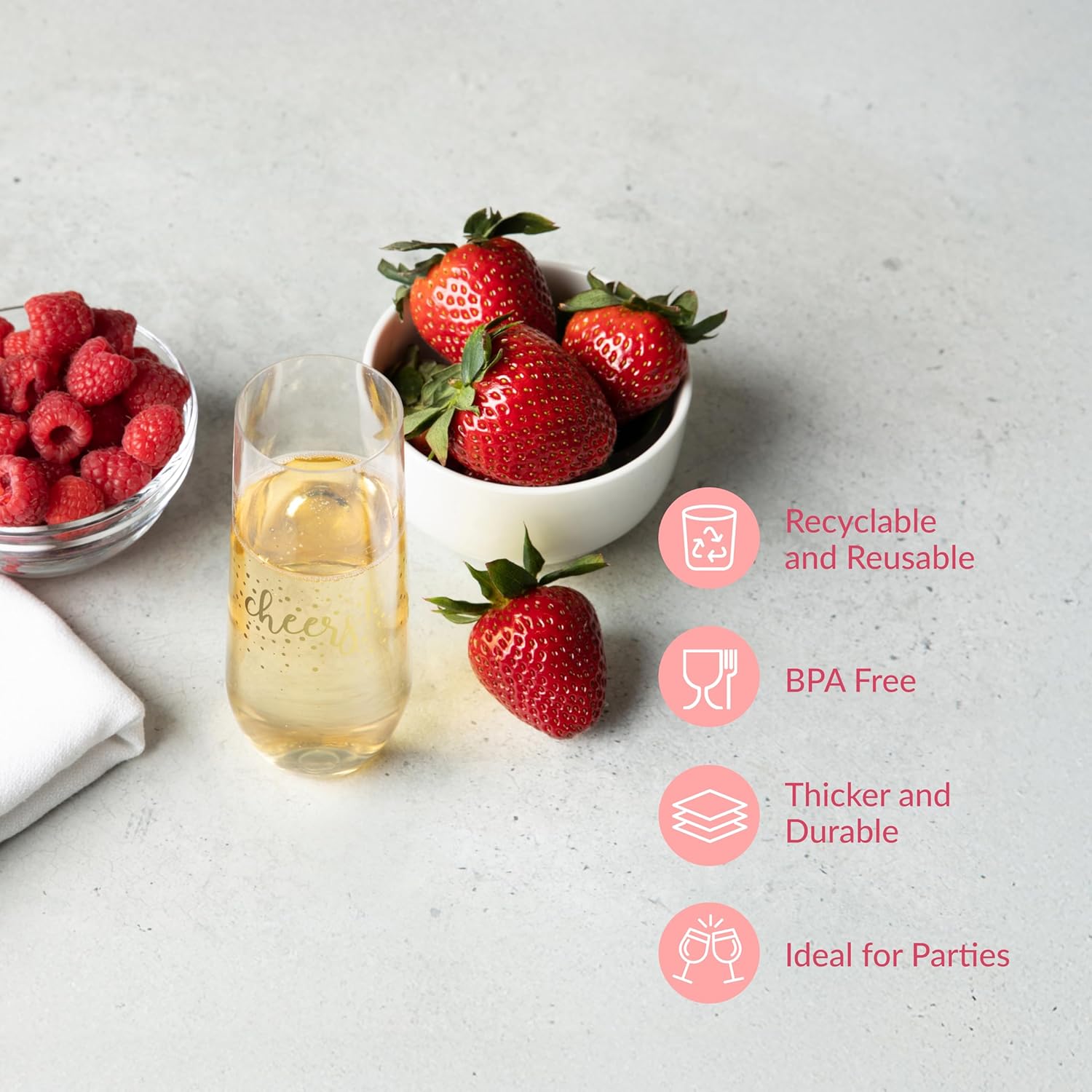 • DURABLE MATERIAL: Unbreakable, recycled PET plastic, these champagne glasses strike the perfect balance between elegance and sustainability. Please note they are not dishwasher safe