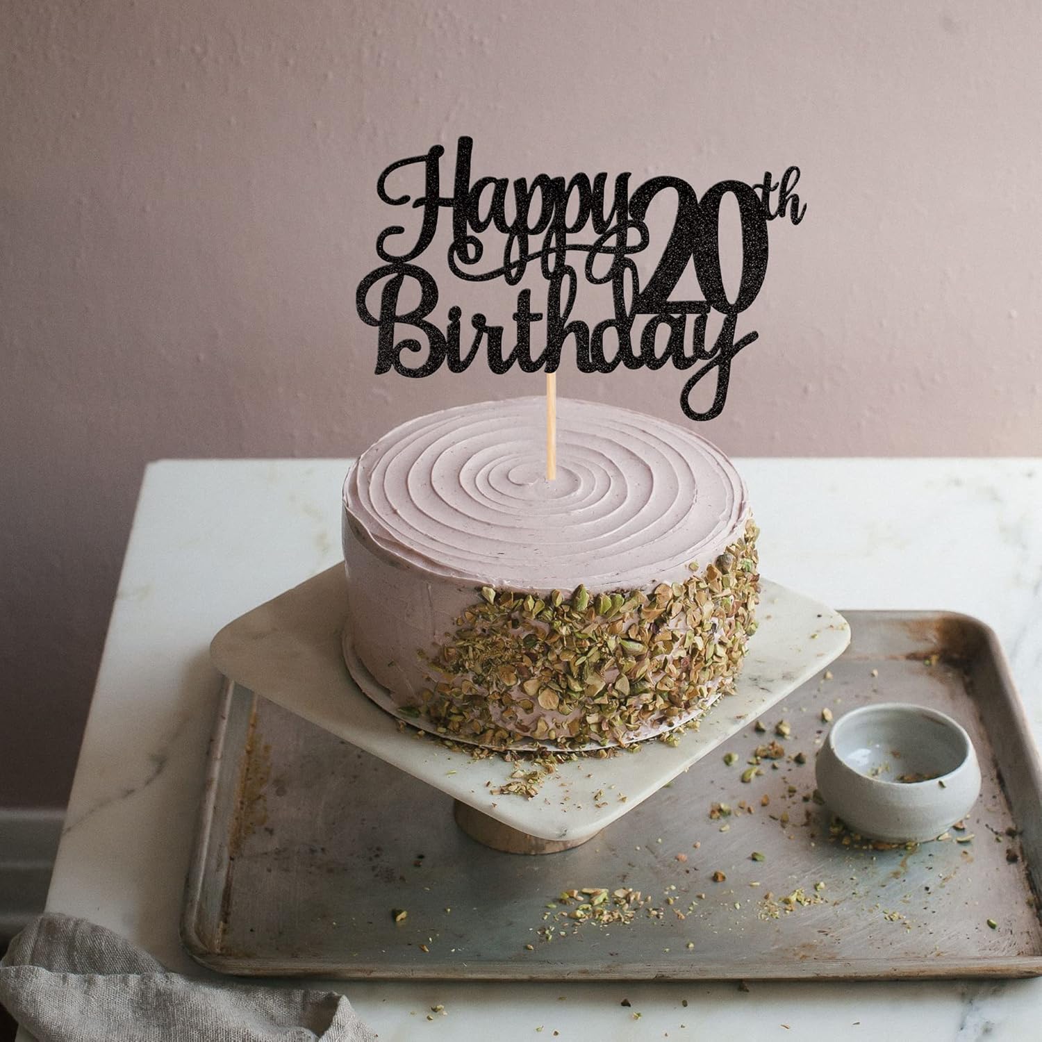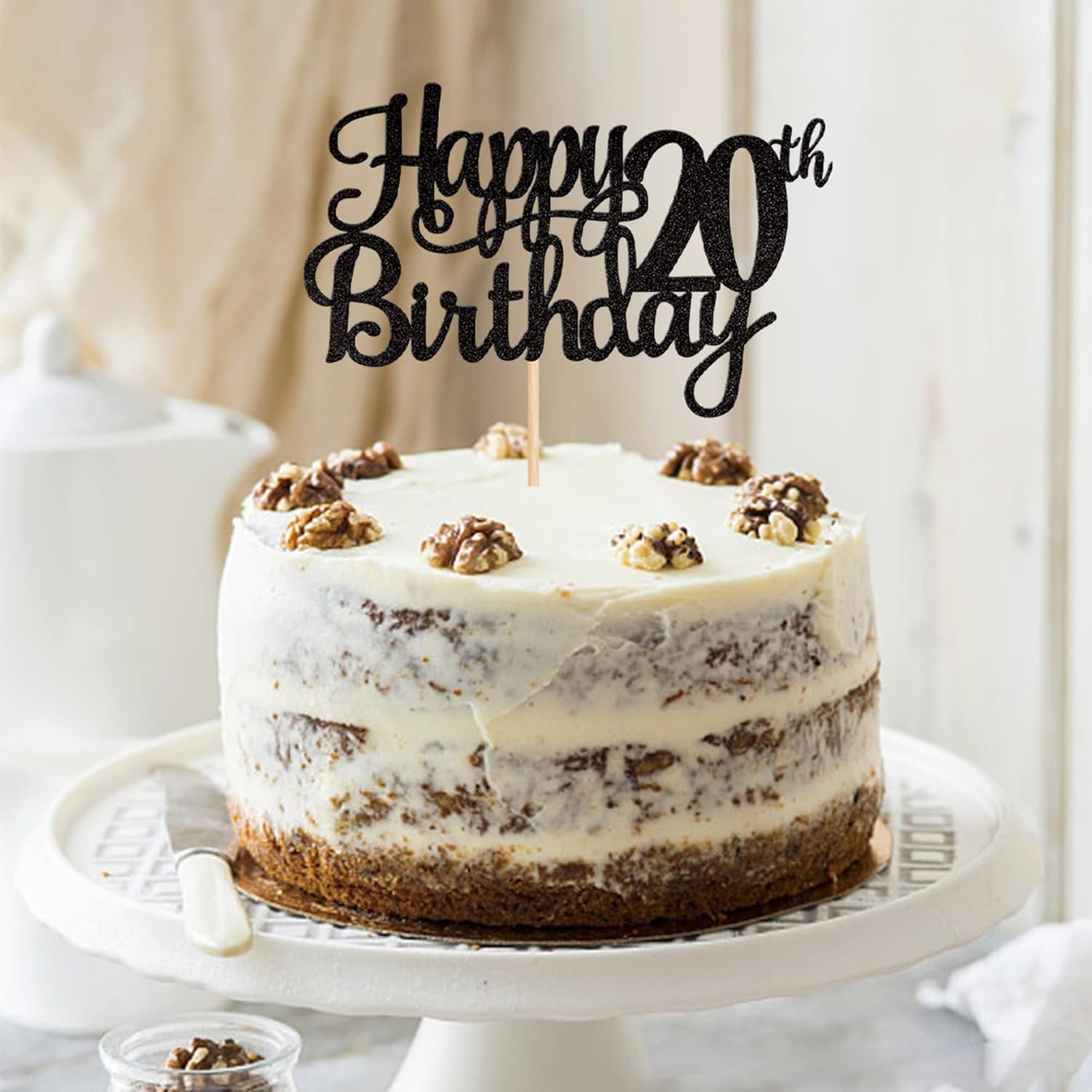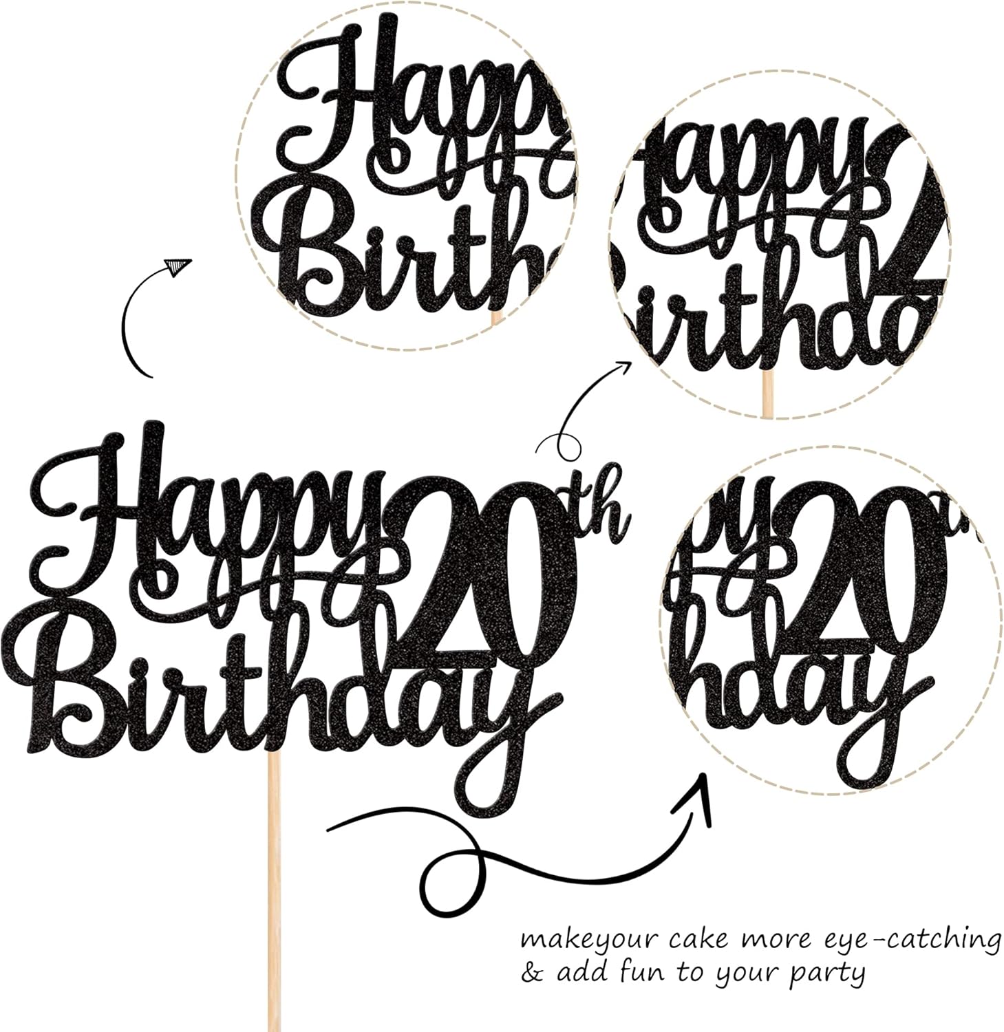 1 PCS Happy 20th Birthday Cake Topper Glitter Cheers to 20 Years Birthday Cake Pick Twenty 20 Fabulous Cake Decoration for Happy 20th Birthday Theme Party Decorations Supplies Black