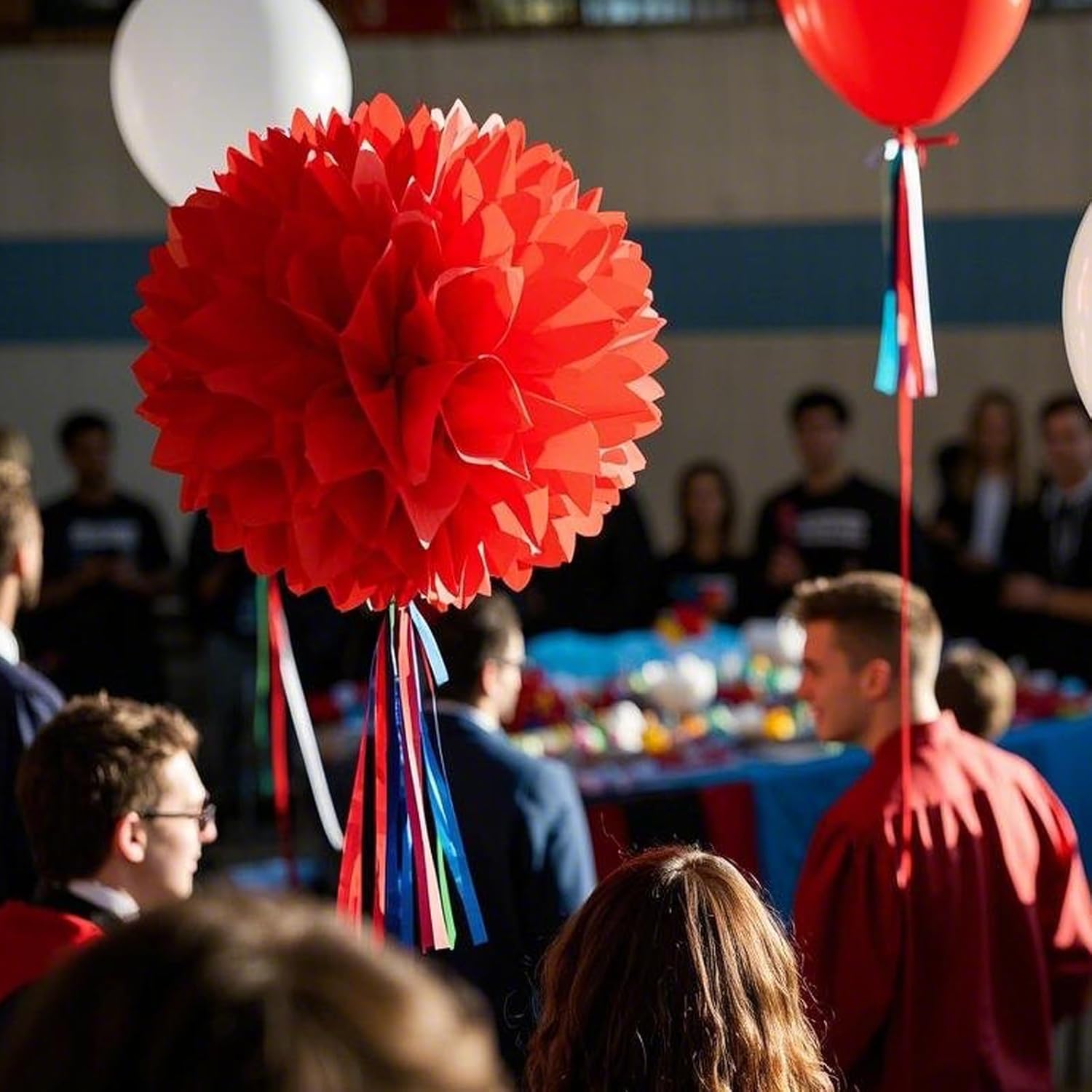 • Precut and folded, simply separate each pom pom paper layer and fluff. A hanging ribbon is included for each paper pom pom.It might be used for indoor and outdoor events, as photo backdrop, as room, table, or chair decoration, hung on ceilings, tents or trees