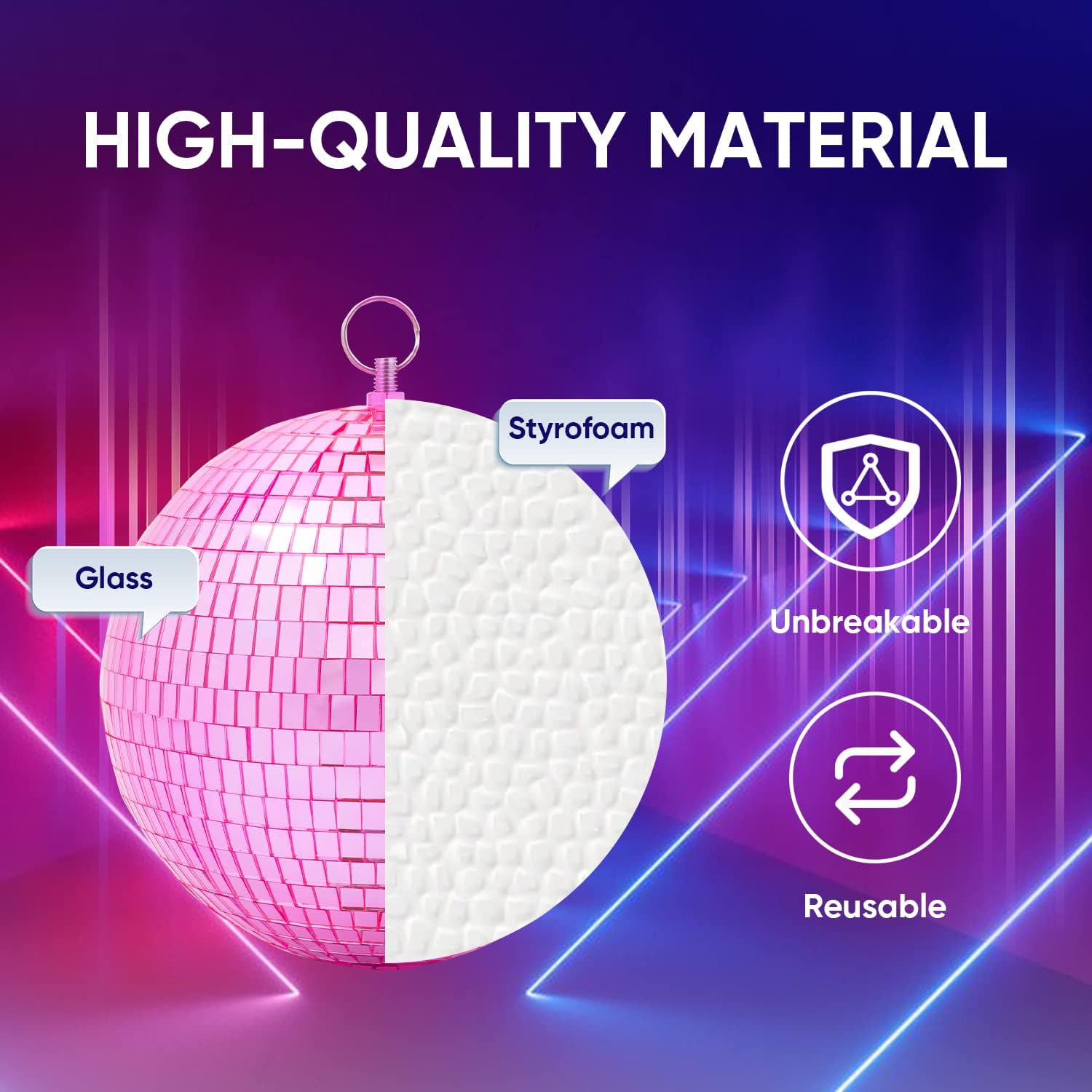 • Material and Structure: You'll love this 8 inch disco ball that provides lots of light; The small disco ball features bright pink tiles glued around a hollow styrofoam core; Spacing of each glass is consistent and the tiles are all the same color, making the light more even; This disco ball can be stored and reused thanks to its solid construction.It makes great disco party decorations