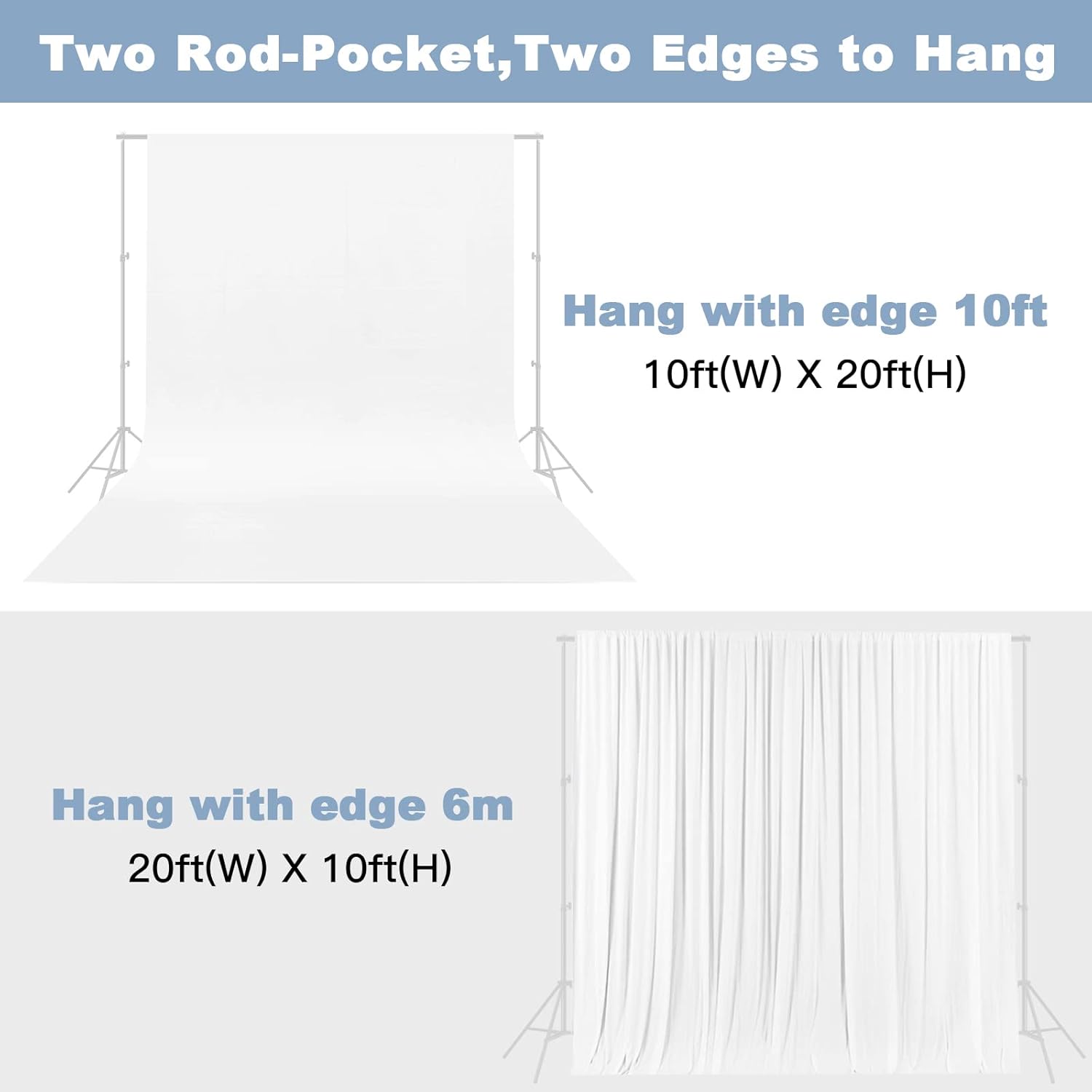• 【TWO ROD-POCKET & TWO SIDES TO HANG】The white photo backdrop come with two pockets (2.36 inches), one on the short edge (10ft), and the other on the long side (20ft ). This white backdrop can work as a photography background with 10ft side hanged, and it can also work as a party curtain backdrop with 20ft side hanged.