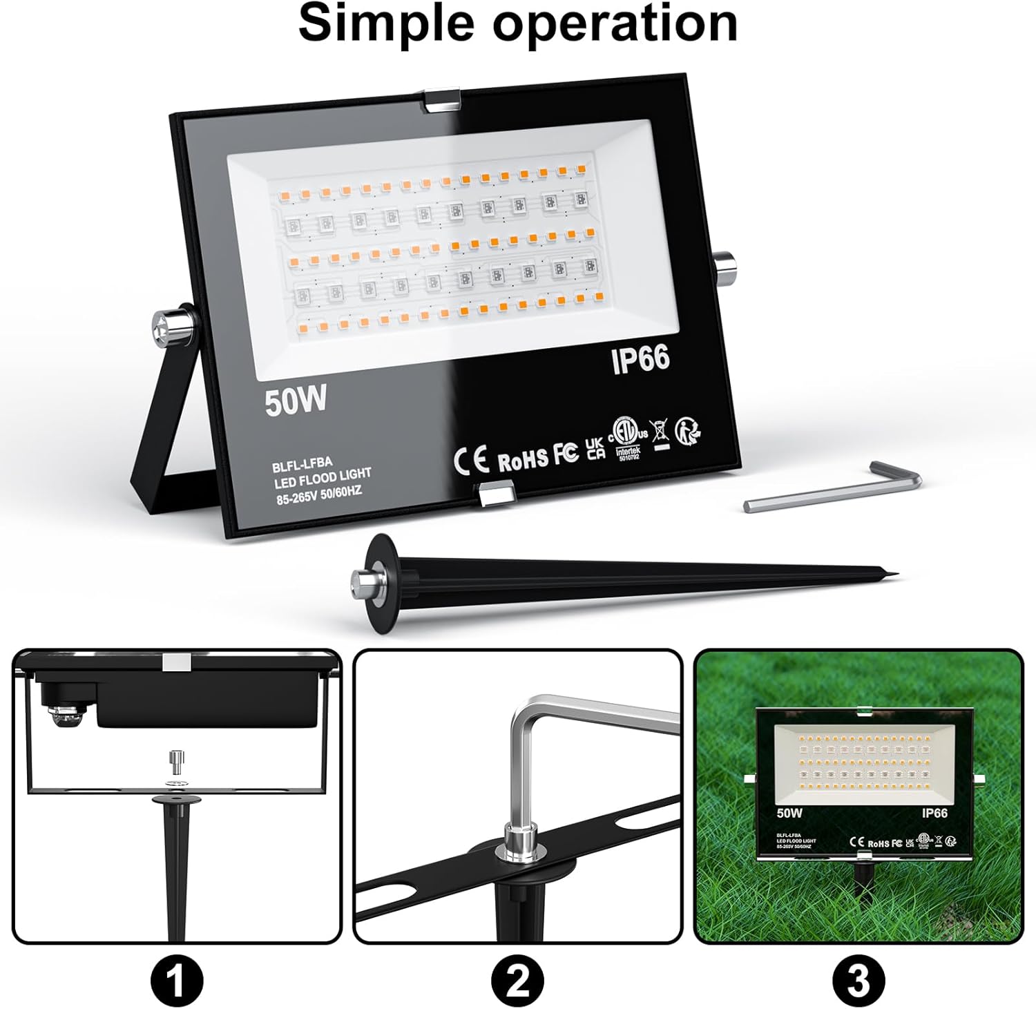 • 【Smart Bluetooth flood lights outdoor/indoor】50W Led flood light with Metal Ground Stakes with APP control: Warm White 2700K, CRI>85, 16 million multicolor static colors and 23 dynamic modes, include ''DIY Flash'' mode, and '' DIY fade'' mode, group control, single control,timing, strobe, DIY scenes. Suitable for daily, mood and decorative lighting. You can use rgb flood light as landscape lighting, uplight, led stage lights, spotlight, strobe lights, accent lighting, background lights, security lights, wash lights, floor light. No registration nor internet required