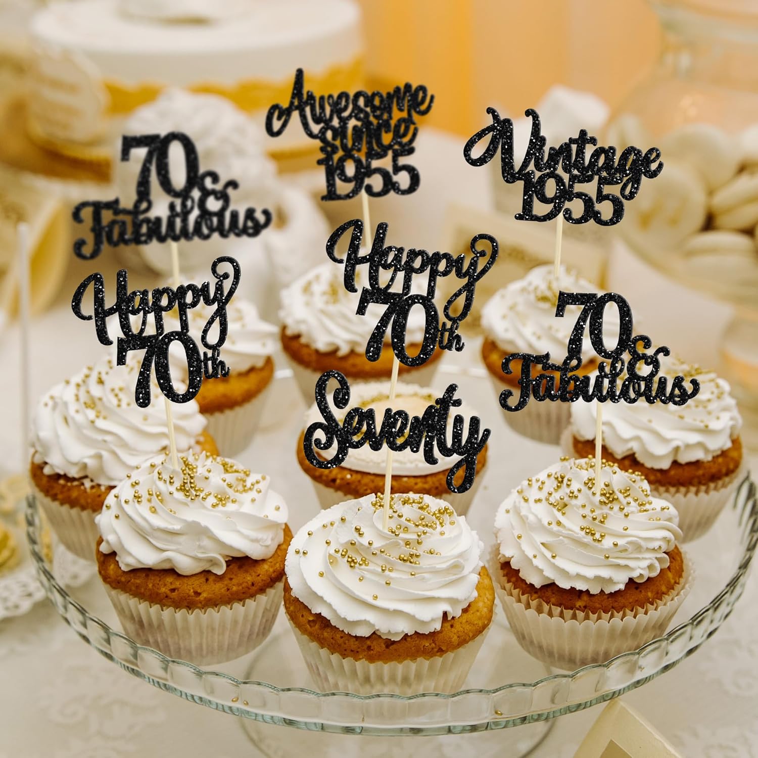 30Pcs Happy 70th Birthday Cupcake Toppers Glitter Seventy Vintage 1955 Cupcake Picks Cheers to 70 Fabulous Cake Decorations for 70th Birthday Wedding Anniversary Party Supplies Black