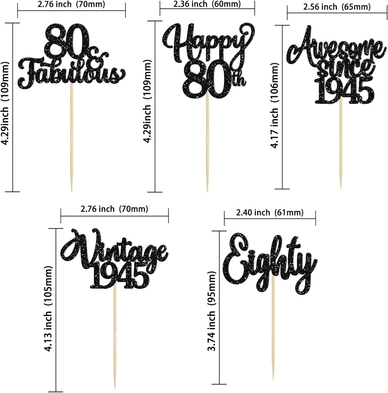 30Pcs Happy 80th Birthday Cupcake Toppers Glitter Awesome Since 1945 Eighty 80 Fabulous Vintage 1945 Cupcake Picks for 80th Birthday Anniversary Retirement Party Cake Decorations Supplies Black