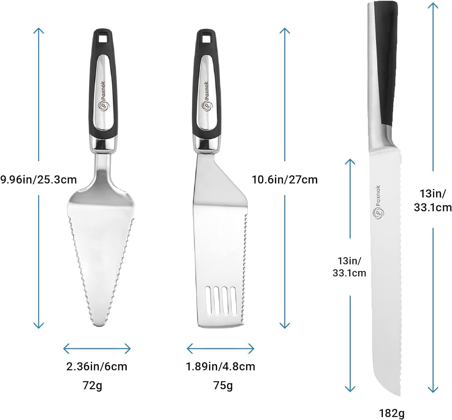 • THE PIE SERVER SET, CAKE SERVER SET AND BREAD KNIFE: Includes double serrated pie spatula server, serrated cake spatula server, and bread knife making it a versatile kitchen tools whether it's a pie, birthday cake, wedding cake, anniversary, pizza, or any special occasion, our cake set is the perfect addition to your kitchen and will help you create unforgettable moments with your loved ones.