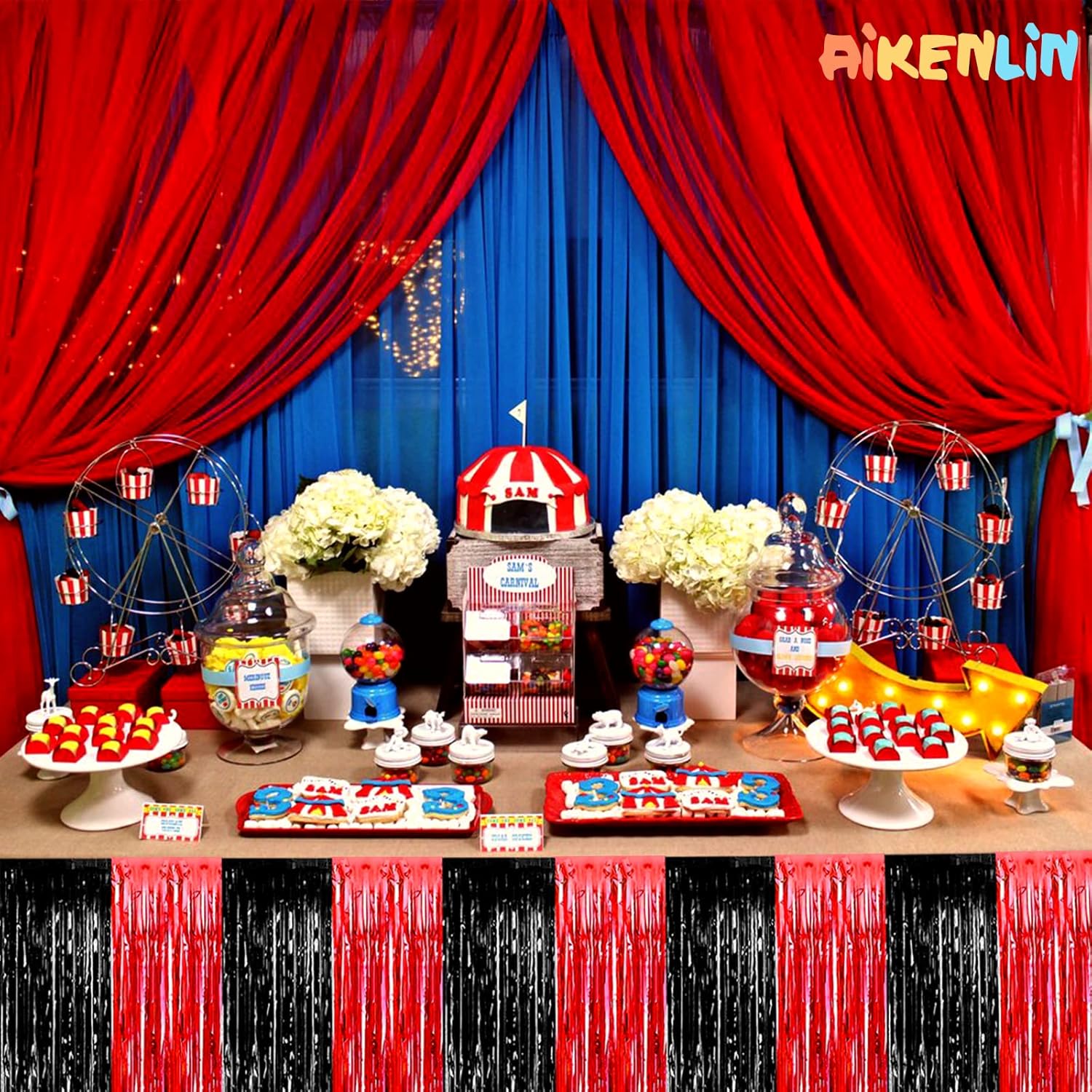 6 Pack 29x108 Inch Black Red Metallic Foil Fringe Tinsel Table Skirts for Rectangle Tables Streamer Curtains Backdrop for Wedding, Casino Viva Las Vegas Game Night Birthday Party Decoration