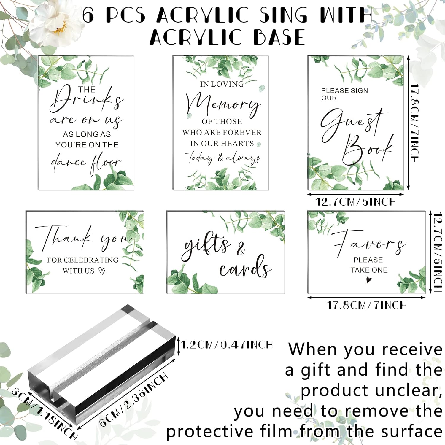• Size Detail: the acrylic board of the wedding welcome sign measures approx. 5 x 7 x 0.08 inches/ 12.7 x 17.8 x 0.2 cm, the base is approx. 2.36 x 1.18 x 0.47 inches/ 6 x 3 x 1.2 cm, portable and lightweight, will not take up too much space to display