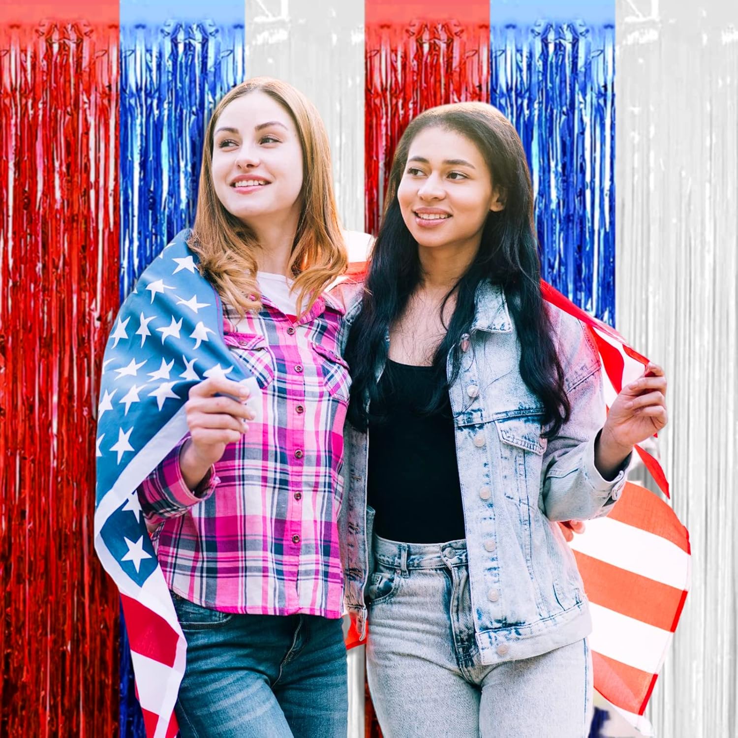 4 Pack Red Blue White Foil Fringe Curtain Backdrop, 3.28Ft x 8.2Ft Metallic Tinsel Foil Fringe Streamers Curtains for Photo Booth, Wedding, Mardi Gras, Birthday, Independence Day Party Decoration