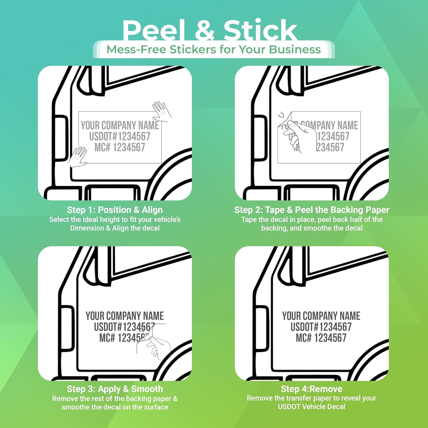 • CUSTOMIZABLE TRUCK DOOR VINYL STICKERS DECALS: Customize your decals for vehicles with your company name, address (optional), USDOT, MC, GVWR, VIN, and any text. We offer various options for you to select your size, color, or any other font type that suits your brand. Custom vinyl decals are ideal for business use in trucks, trailers, or fleets.