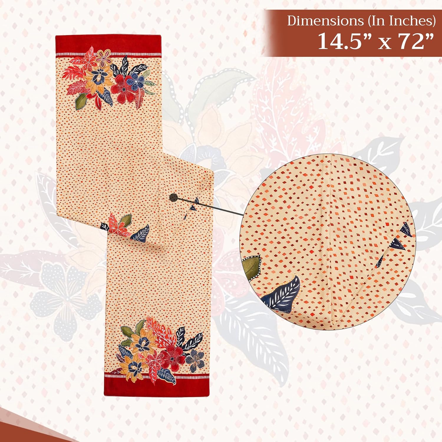 • Package Includes: 1 table runner measuring 14.5" x 72", made from 100% cotton. Ideal for banquet tables, dining tables, or adding a spring, Thanksgiving, or Christmas touch to your party decor. This 72-inch table runner brings unique charm to both casual and festive settings