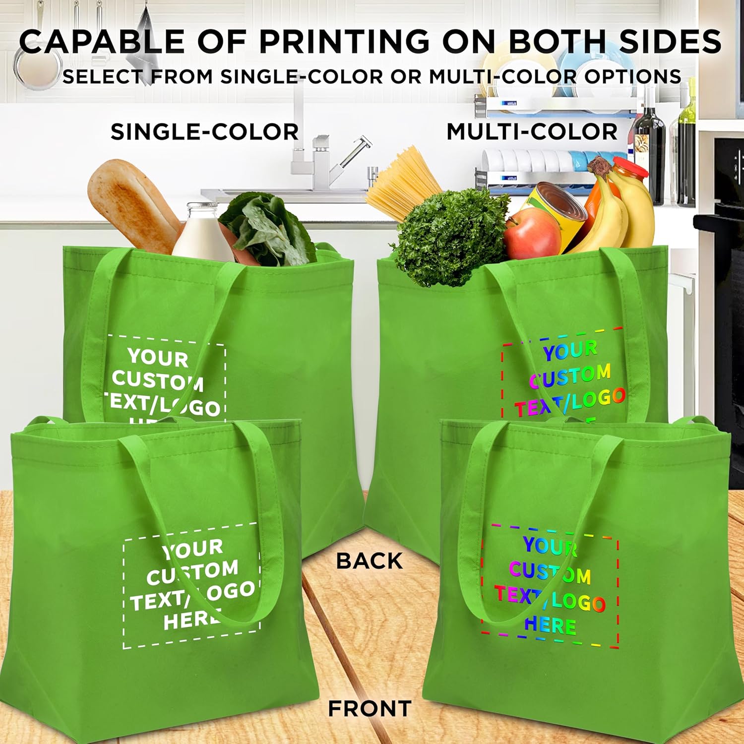 DISCOUNT PROMOS Custom Southern Style Grocery Tote Bags Set of 50 - Personalized Bulk Pack, Reusable Grocery & Shopping Bags - Great for Travel, Business Promotions - Lime Green - 20"X13"X8"