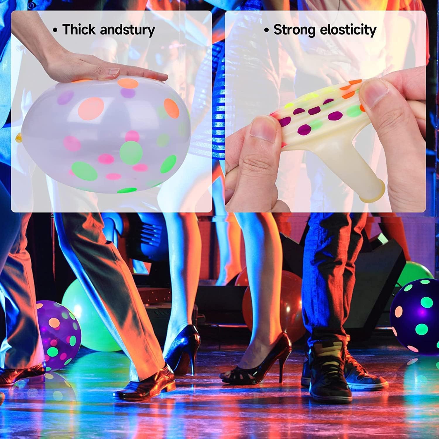 • ★【Polka Dot Neon Balloons】: Balloons for glowing party decorations, contains 90 black light party balloons, including: 30 black polka dot balloons, 30 transparent polka dot balloons, 30 colorful balloons, turn on your UV black light, in Make it super bright in a dark party theme for a stunning visual effect