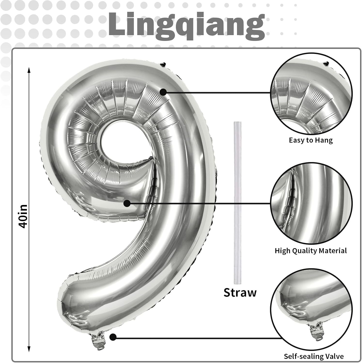 • 🎉 Silver Number 9 Balloon 🎉 - You will get 1pc 40 inch mylar foil number 9 balloon and 1pc straw. Perfect for 9th 19th 90th birthday or anniversary party decorations supplies.