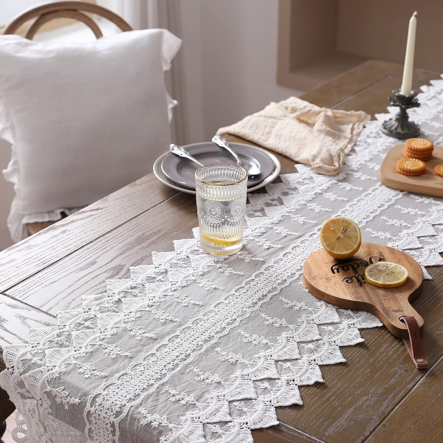 • Package Includes: 1pc lace table runner. The length of the tablecloth hanging on one side in the display picture is about 40cm (16 inches). Please choose the fitting size to achieve the desired matching effect. The above suggestions are for reference only. Please choose according to the actual measurement when buying. 【Warm tips】: Lace table runner will shrink after washing, it is recommended to buy a larger size!
