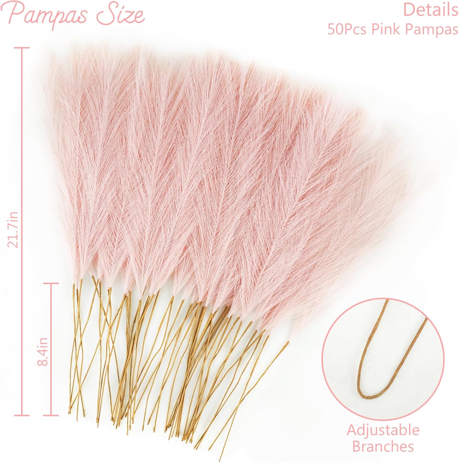 • Pink Pampas Grass Decor: You will get a pack of 50pcs artificial pampass grass, each stem 21.6”, and the heads of each stem is designed you can fluff them up for a fuller look, create a chic minimalist, or Bohemian modern display to complement your existing home arrangement