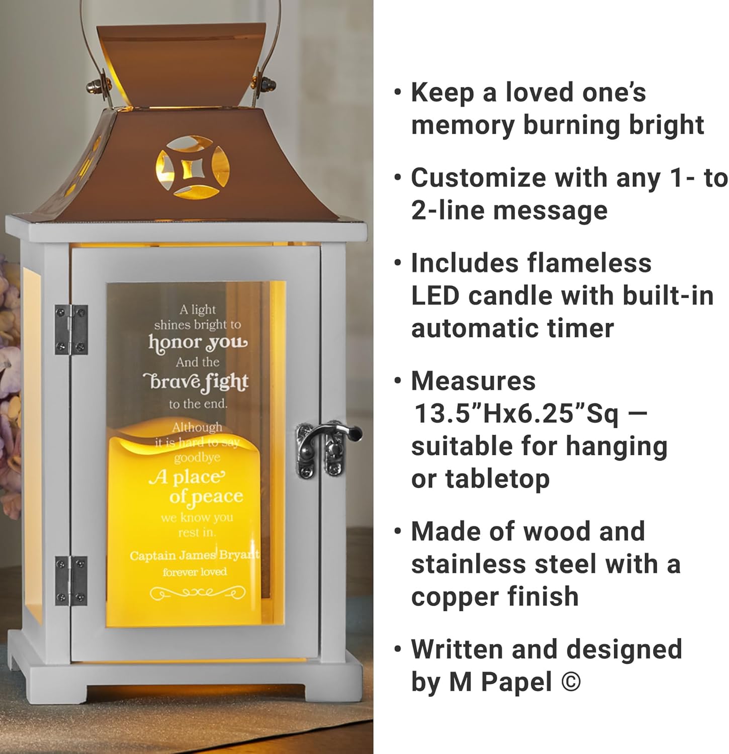 • UNIQUELY PERSONALIZED: Light the way forward! Customize this lantern with any 1- to 2-line engraved message up to 25 characters each. Written and designed by M Papel .