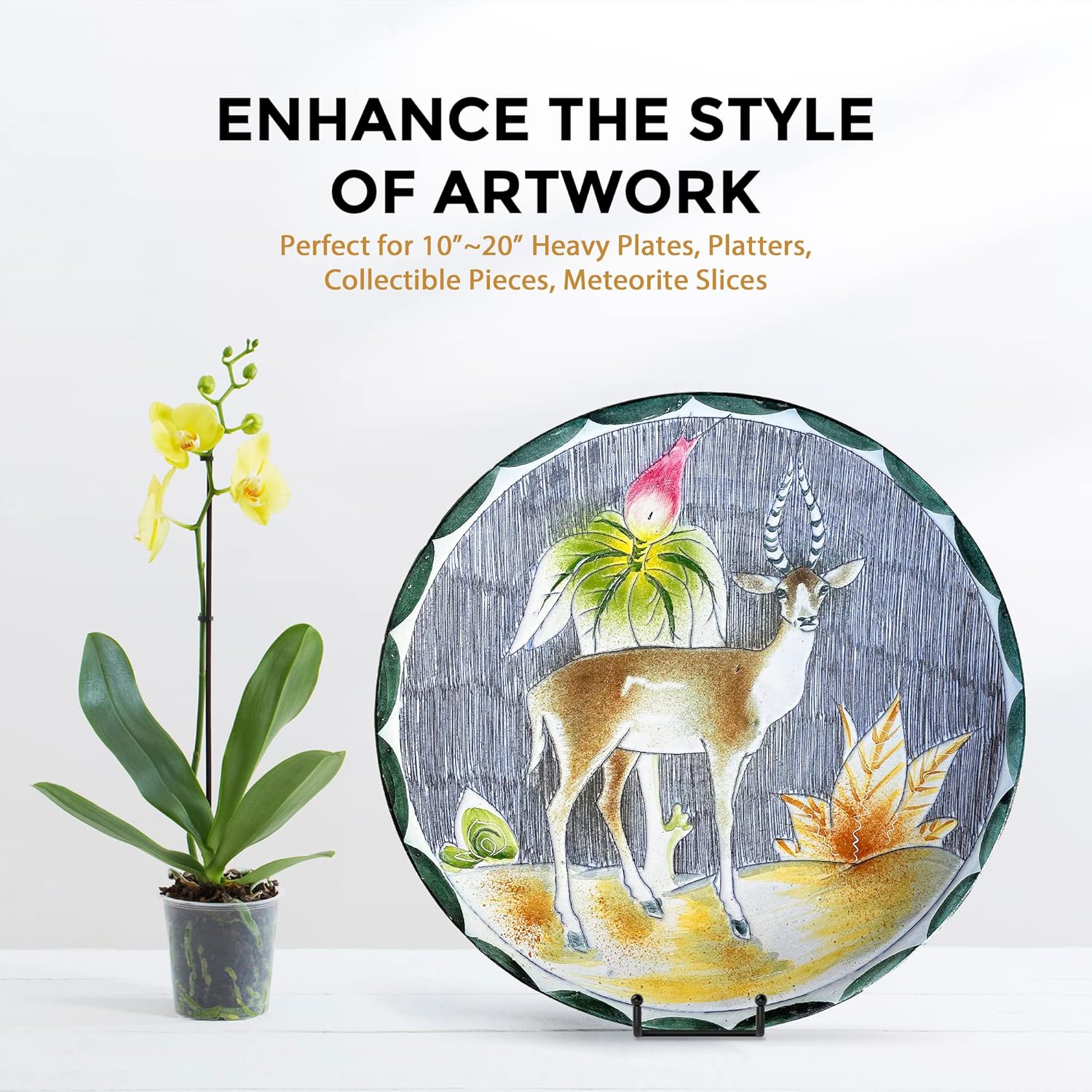 • STURDY DESIGN: - Made with wrought iron construction and a matte black powder-coated finish, this plate display stands features a reliable 8" depth and 4" widened base design, capable of securely displaying a variety of large items such as decorative plates, platters, plaques, photo frames, trays, tiles, cutting boards, cookbook, sign, canvas art, and more.