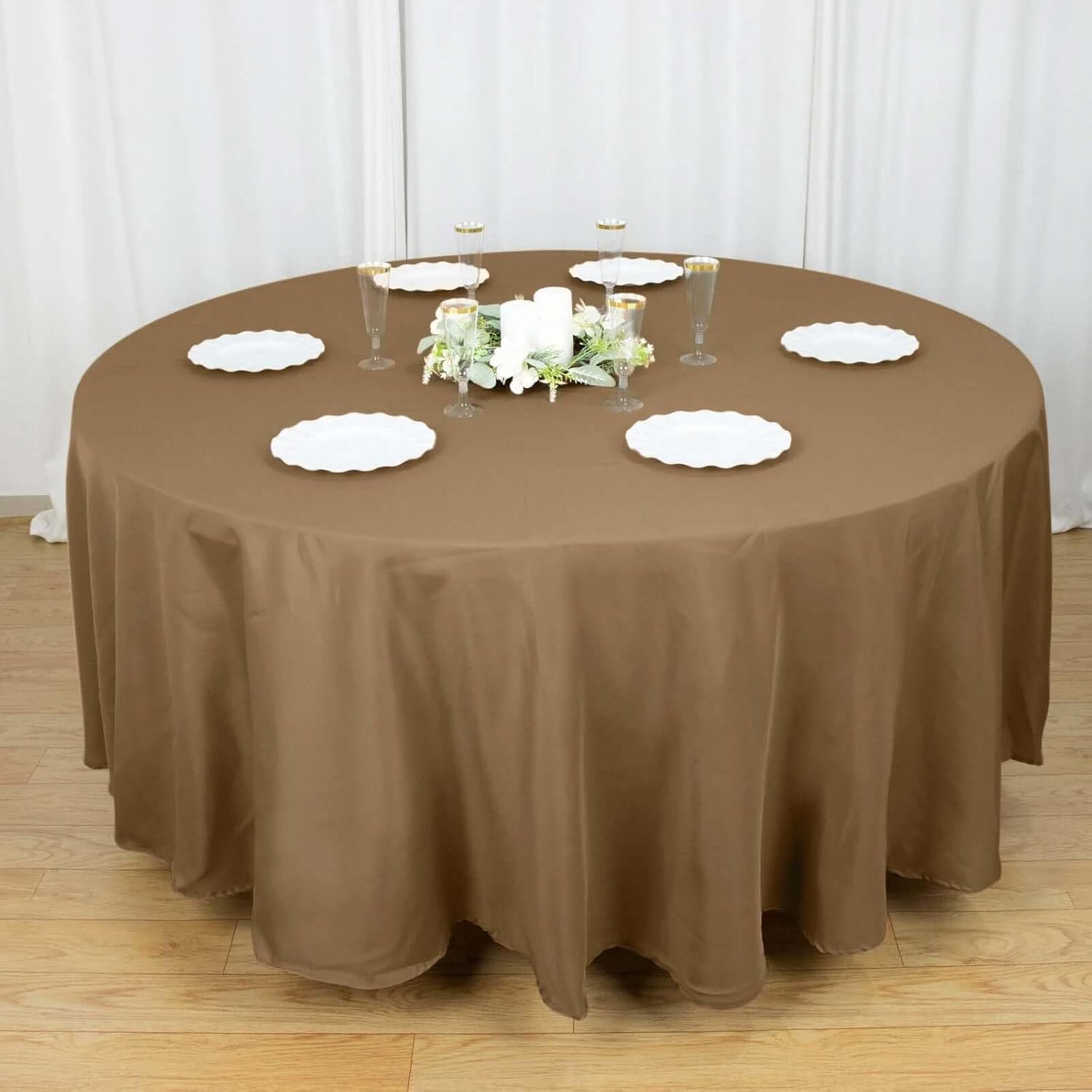 • Quantity: 1 Tablecloth Material: Polyester Color: Taupe Size: 108" Round Thickness: 200 GSM 1 piece, seamless design. Features: Stain & Wrinkle Resistant, Machine Washable Hemmed edges for an exquisite look. Gives floor length hang on standard 4ft (48") tables.