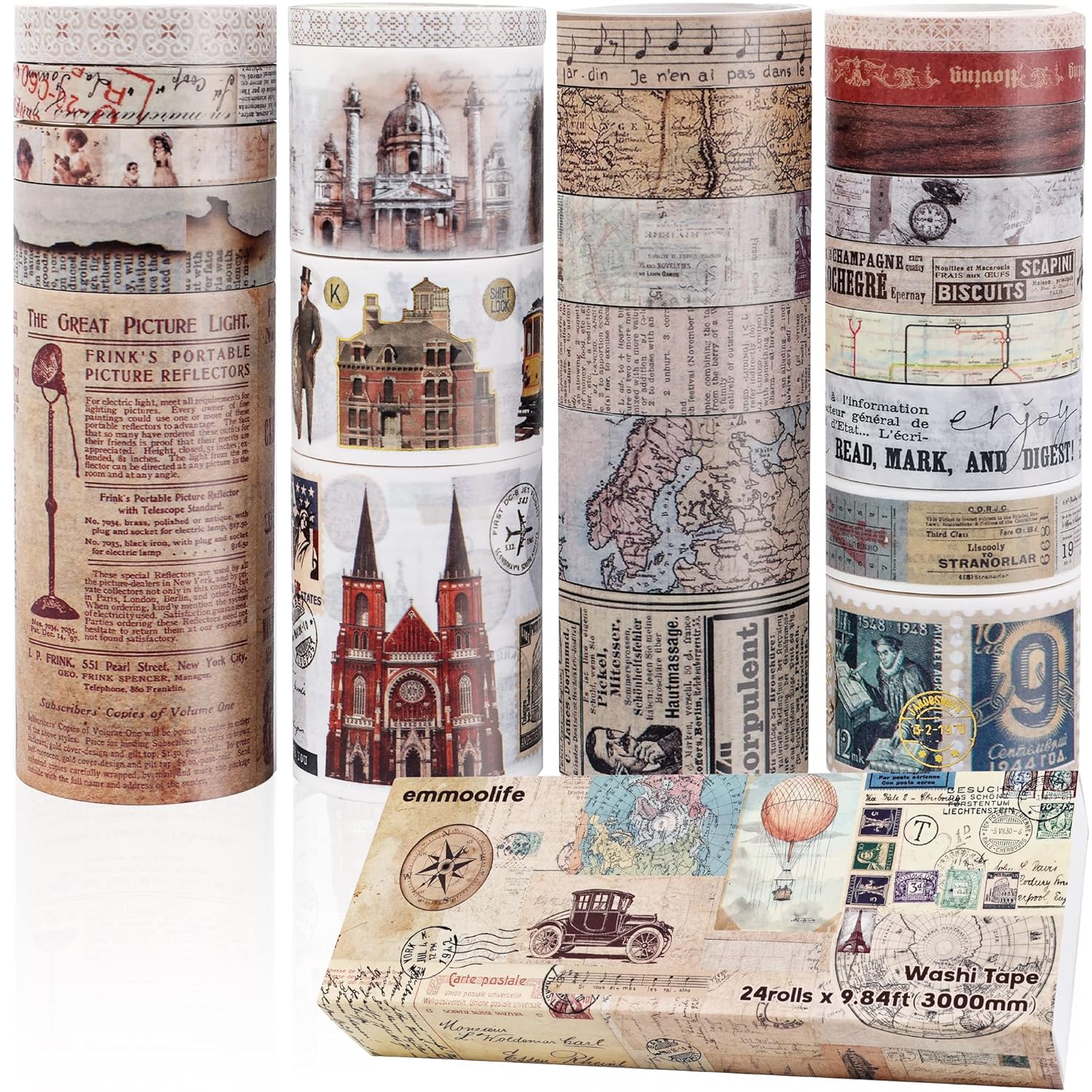 24 Rolls Vintage Washi Tape Set, Antique Car Buildings Map Stamp Stripe Writable Aesthetic Washy Decorative Tapes for Scrapbooking, Junk Journal Supplies, Bullet Journaling 5-75mm Wide (3m Long)/Roll