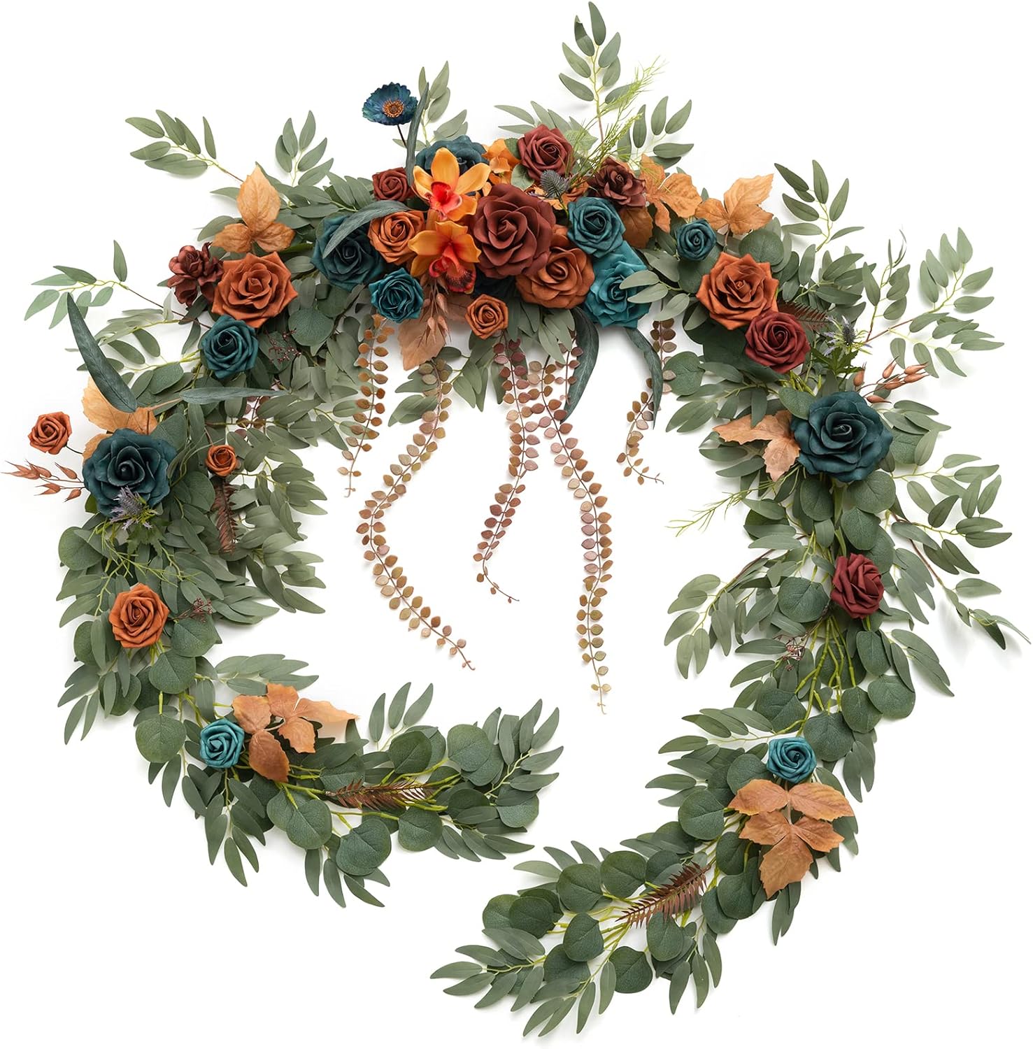 Ling's Moment 9FT Flower Garland for Backdrop Decoration - Fall Wedding Arch Flowers, Eucalyptus & Rose, Artificial Floral Garland for Mantle - Sweetheart Table Decor for Ceremony, Teal & Orange