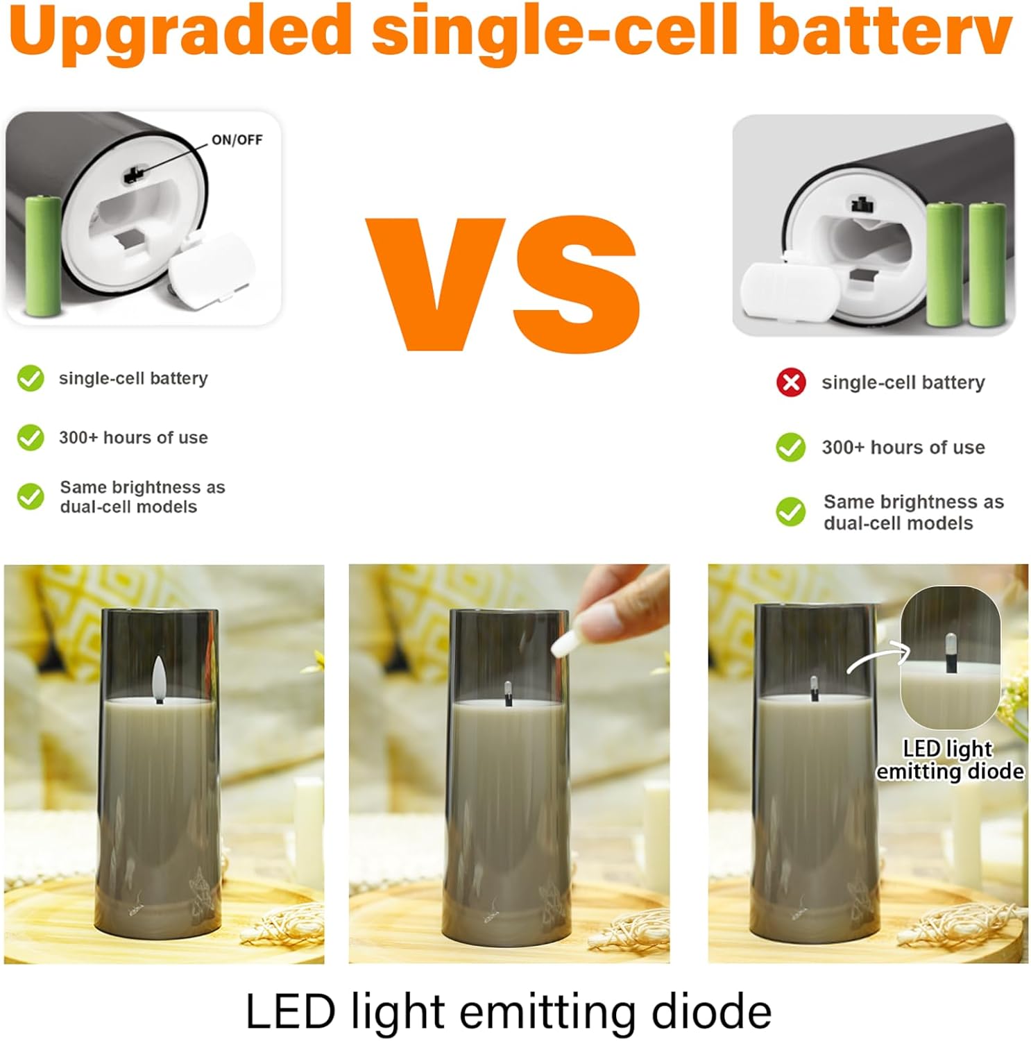 • UPGRADED VERSION - SINGLE BATTERY:Introducing our flameless candles with an advanced battery technology that lasts over 300 hours on just one single battery! That's right, unlike other brands that require two batteries, our candles are powered by only one battery without compromising on brightness. Not only is this energy-saving feature practical and convenient, but it also makes our candles a cost-effective choice.Per battery candle is powered by 1 x AA batteries (Not included).