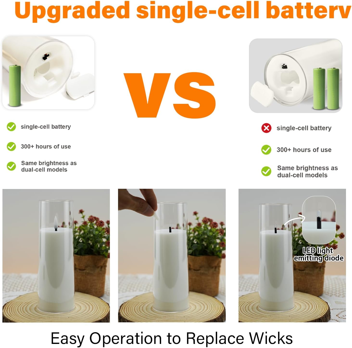 • UPGRADED VERSION - SINGLE BATTERY:Introducing our flameless candles with an advanced battery technology that lasts over 300 hours on just one single battery! That's right, unlike other brands that require two batteries, our candles are powered by only one battery without compromising on brightness. Not only is this energy-saving feature practical and convenient, but it also makes our candles a cost-effective choice.Per battery candle is powered by 1 x AA batteries (Not included).