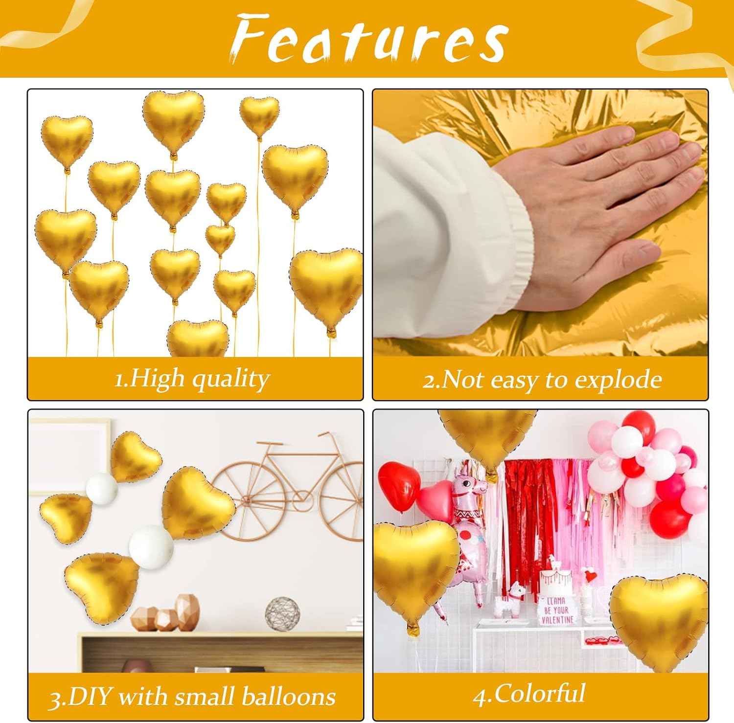 • 💖 10 PCS GOLD FOIL HEART BALLOONS: Package contains 10 x 18 inch gold heart balloons, 1 x 10m ribbon.The gold heart shape balloons are specially shaped, the perfect size for your holiday or party decorating needs, together create a fun and surprising party, leave an unforgettable smile!