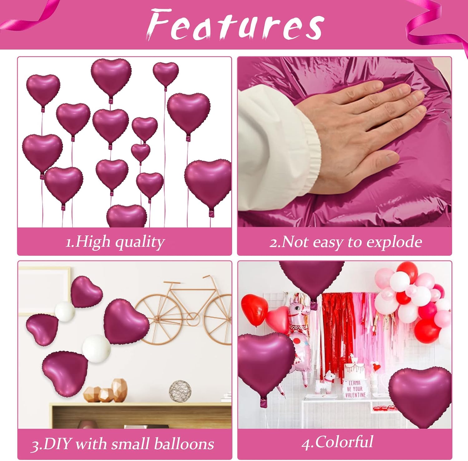 • 💖 EASY TO USE: These hot pink heart birthday balloons can be filled with air and helium (Inflate to 85%-90%, in case it is too large and explodes).The valve seals automatically when inflated, the gas inside can be emptied with a plastic straw, which can be reused later.hot pink valentines balloons set have 10 meters ribbon, you can decorate your room with balloons for your children and spouse.