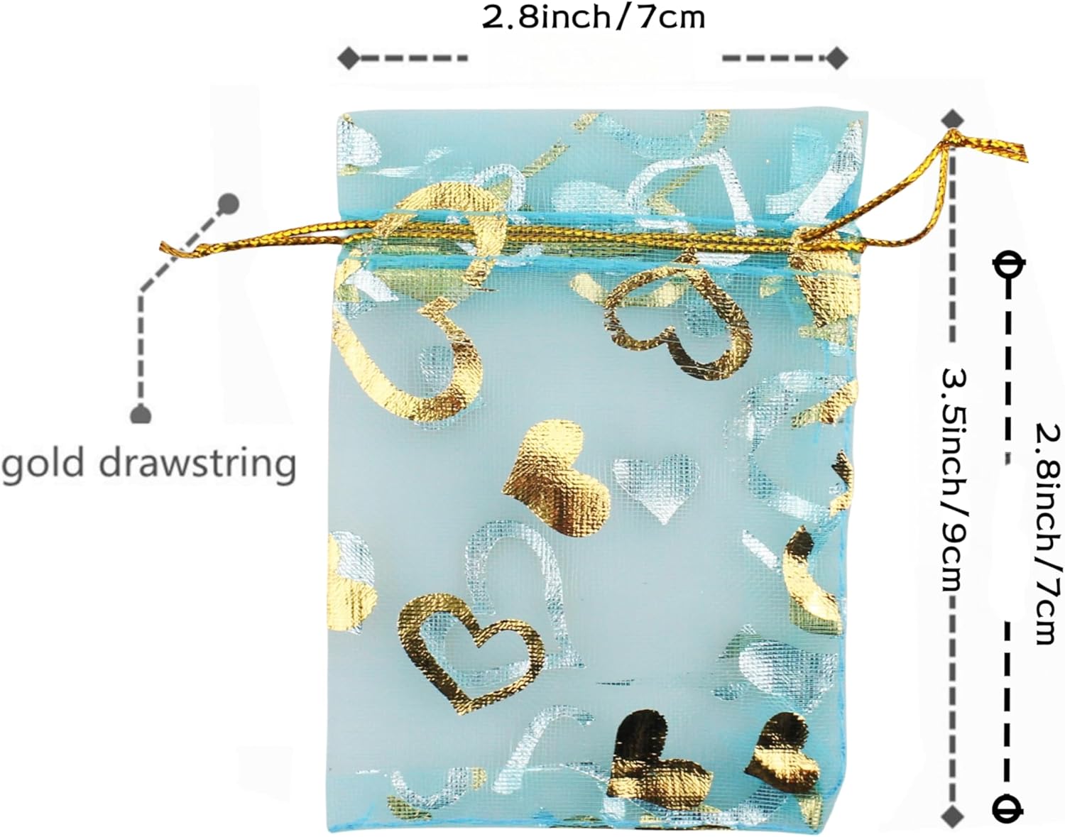 • PROPER SIZE&ENOUGHT QUANTITY: 2.8 x 3.5 inches=7 x 9 cm; Hand made and manual measurement with ±0.2’’ error;Package includes 100 pieces of exquisite organza bags; The bags would come with a nice OPP bag for convenient storage.