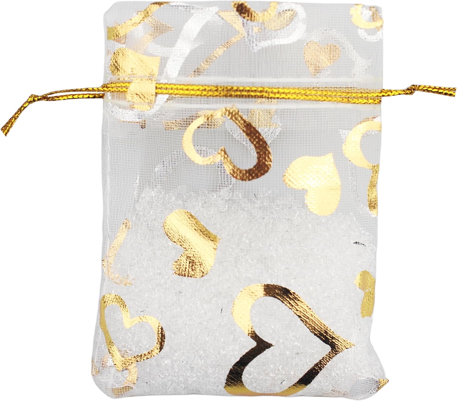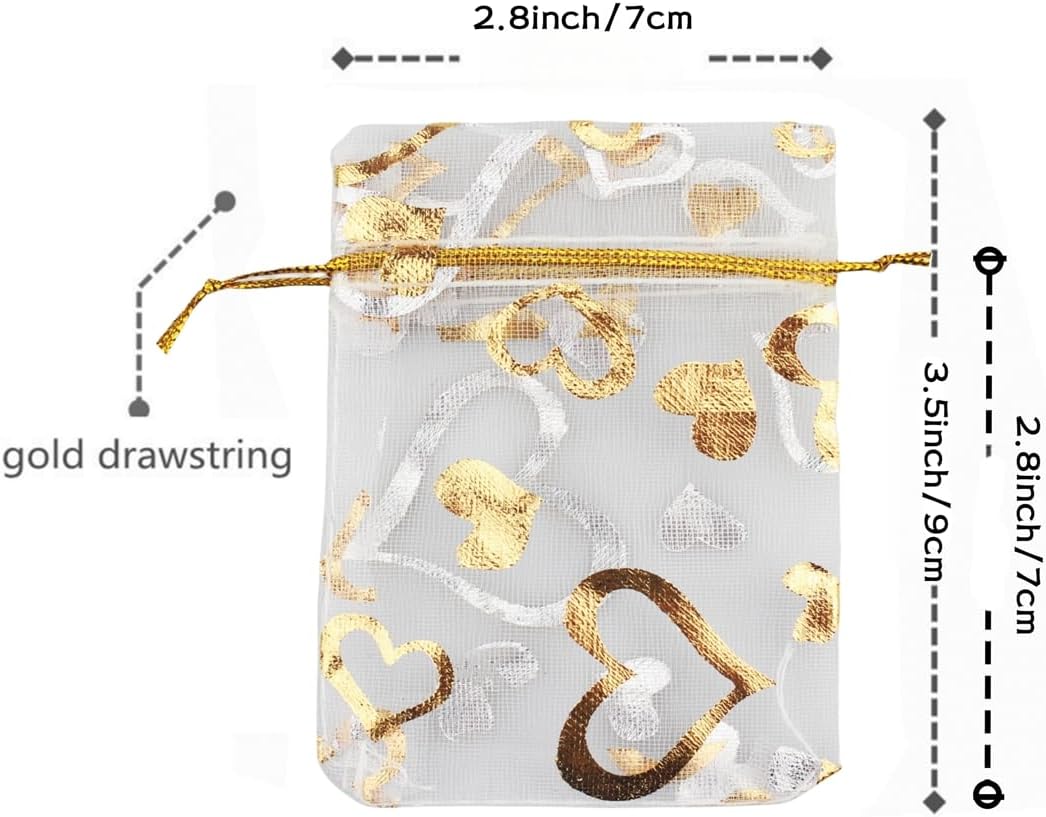QIANHAILIZZ 100 Pack 2.8 x 3.5 Inch Flower Heart Organza Jewelry Gift Pouch Candy Pouch Drawstring Wedding Favor Bags B511S (white gold heart)