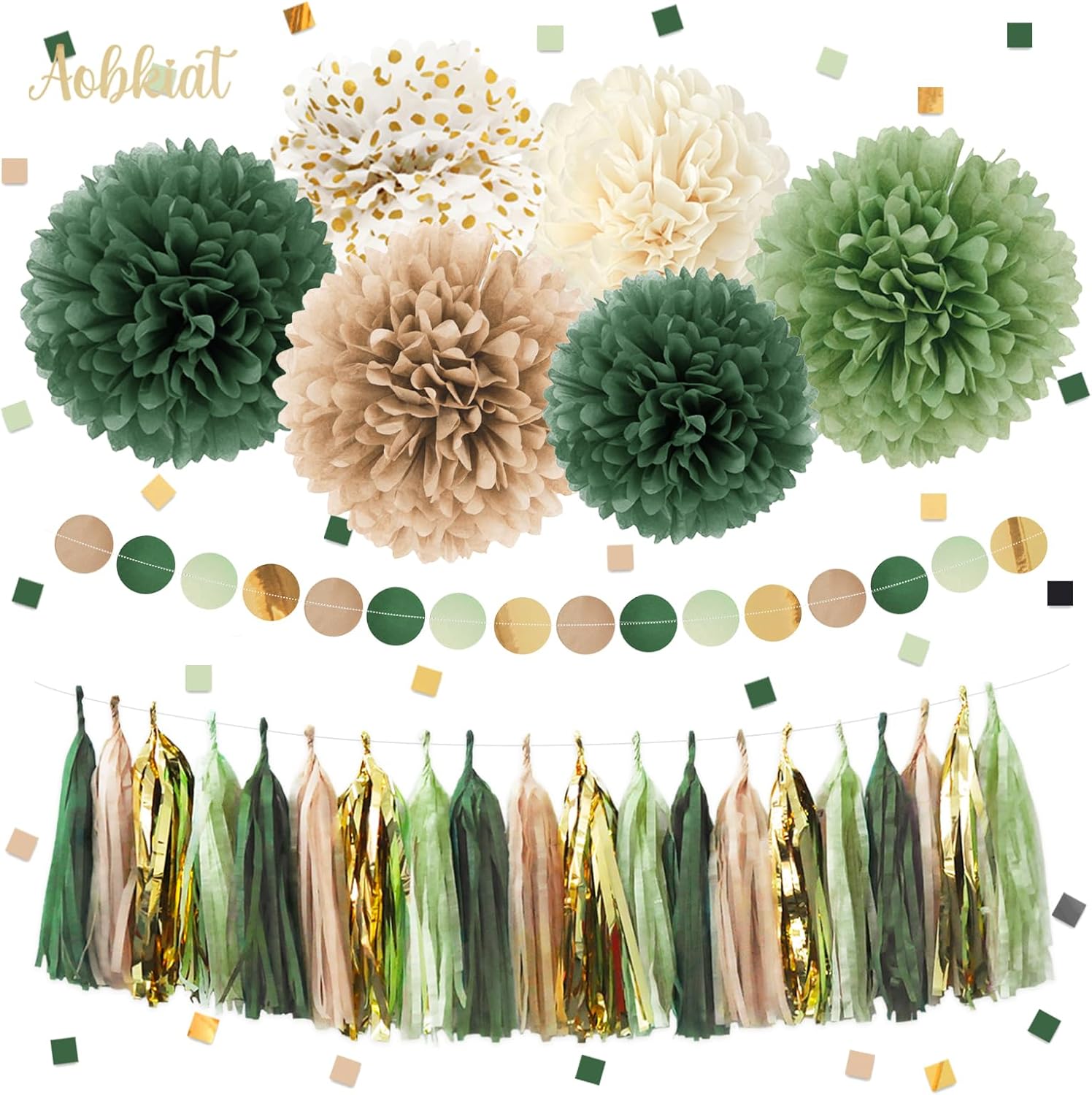 • Natural Colors : Emerald green, ivory and brown will create a vintage and romantic party atmosphere, and you will find that the pompoms will turn the party into a luxurious venue with the dot paper garland and tassel garland