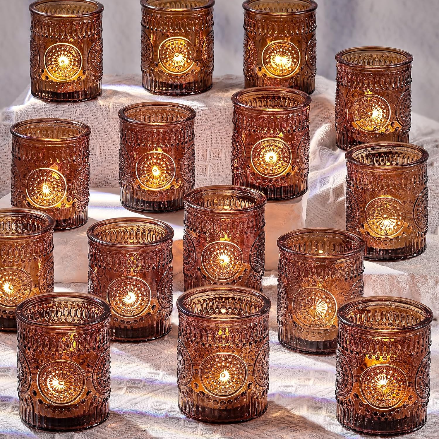 • ❤️❤️[ Votive Candle Holders Set ]❤️❤️: You will get 36 pack amber votive candle holders in your package, measuring 2.1ʺ diameter and 2.56ʺ height approximately, can be used with regular votive candles, tea light candle, and flameless LED tea waxes less than 1.5" in diameter.(Candles Excluded). These glass votive candle holders are the perfect complement to any dining table, which can be used with regular votive candles, tea light candles, flameless LED tea waxes, and edible butter candles, creating a warm and inviting ambiance that enhances the dining experience.