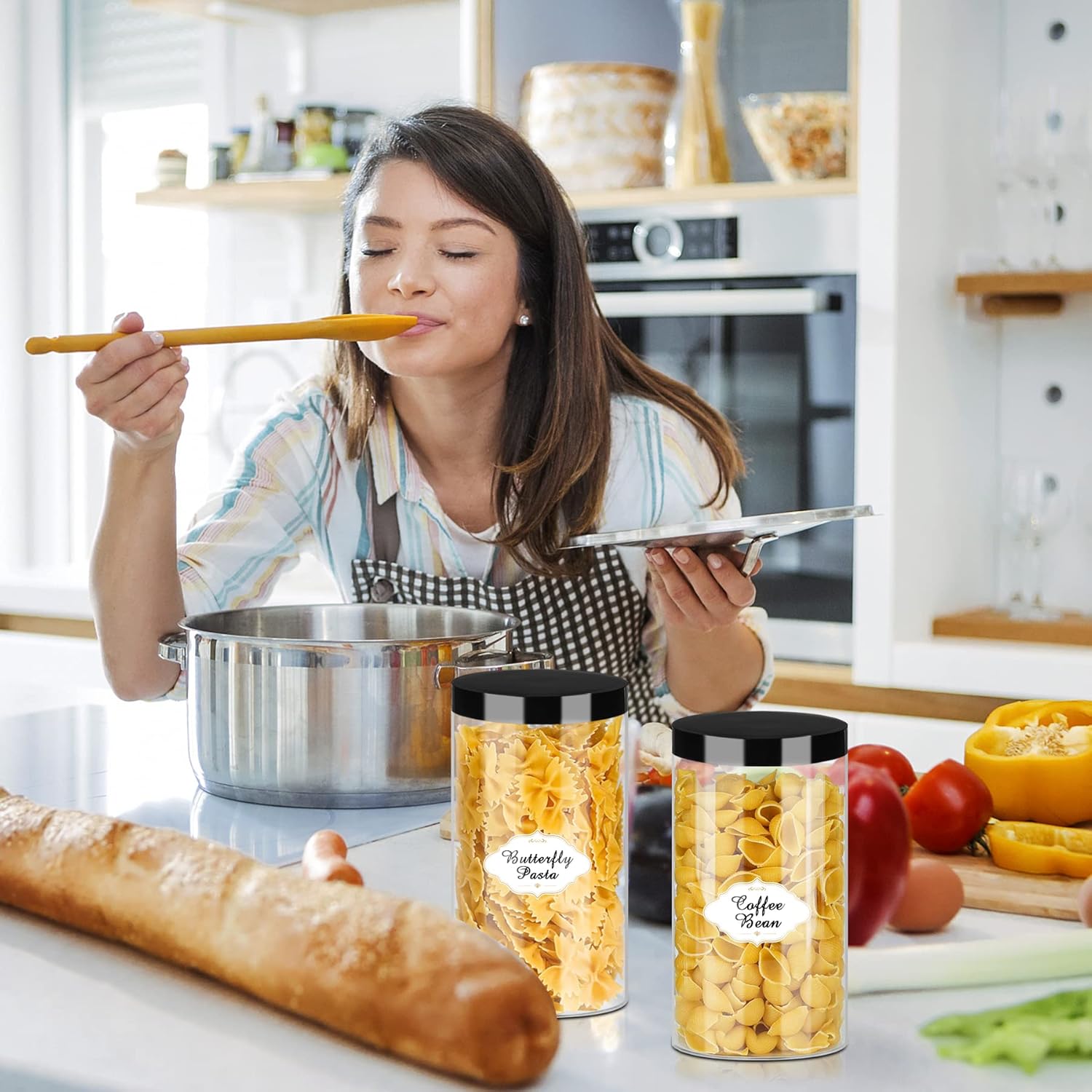 • Package & Tips: 32 oz plastic jars totally 16 pcs plastic containers with black lids, you will get 24 pcs stickers for the plastic jars with lids and 1pc pen. These clear plastic jars kit meet all your different uses. WARM TIPS: DON’T put the clear round jars in dishwasher. DON’T use these plastic round jars for holding hot items. DON’T put the jars in the microwave to avoid melting. Please wash the plastic jars with lids with warm water before first use