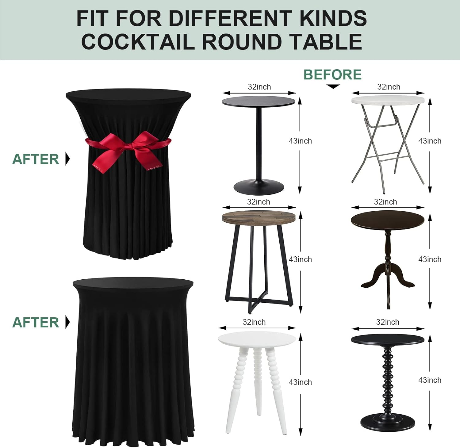 • Skirt Design - These are uniquely designed cocktail table covers that fit any tall round table with a diameter of approximately 32 inches and a height of approximately 43 inches, whether the bottom is an X style or a single center column