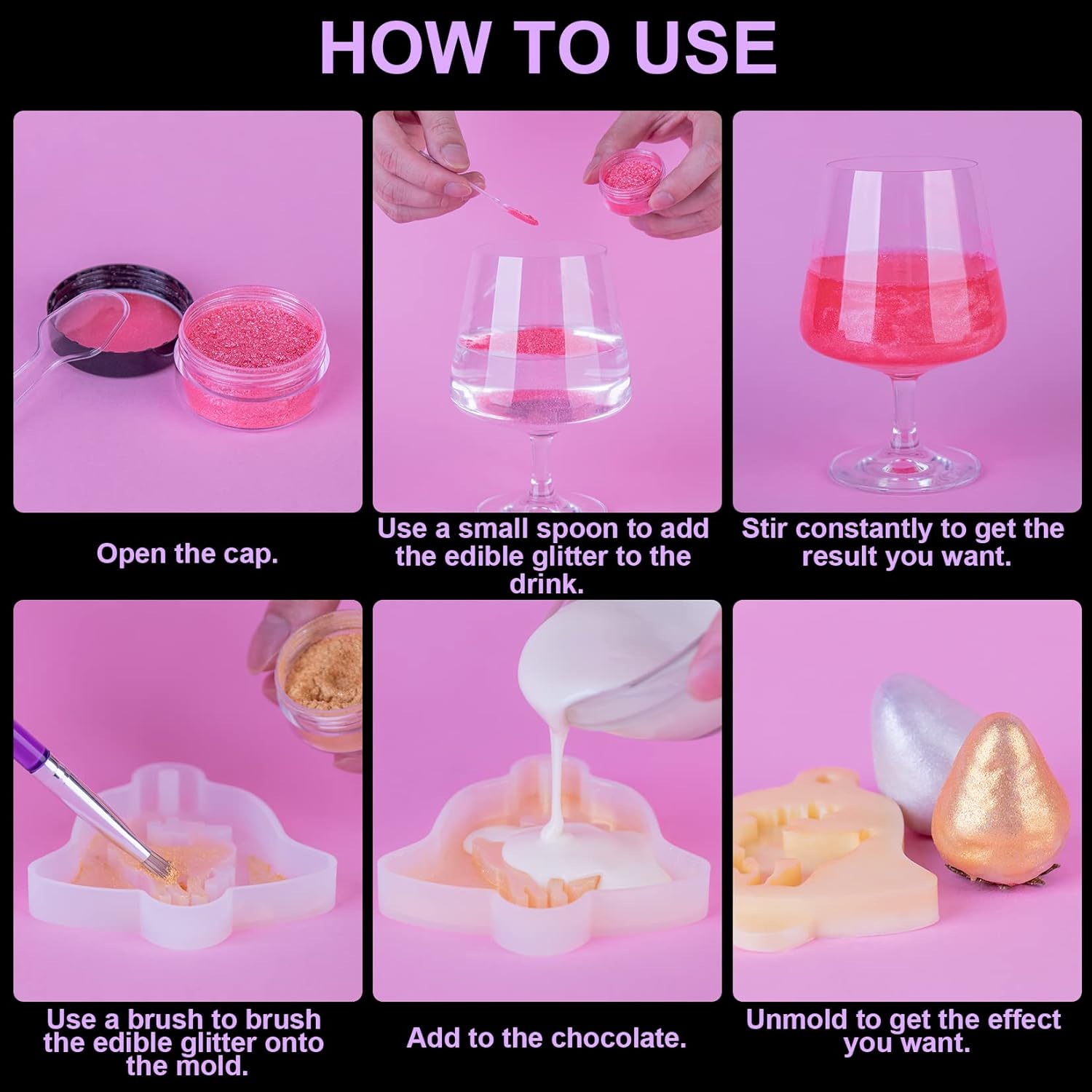 • Edible Glitter for Drinks Set - Our prism powder edible glitter is not limited to one color, we have pink, orange, strawberry red, silver, yellow, light violet, green, navy blue, rose gold, glitter gold. Obviously, our edible glitter can meet more of your needs at once.