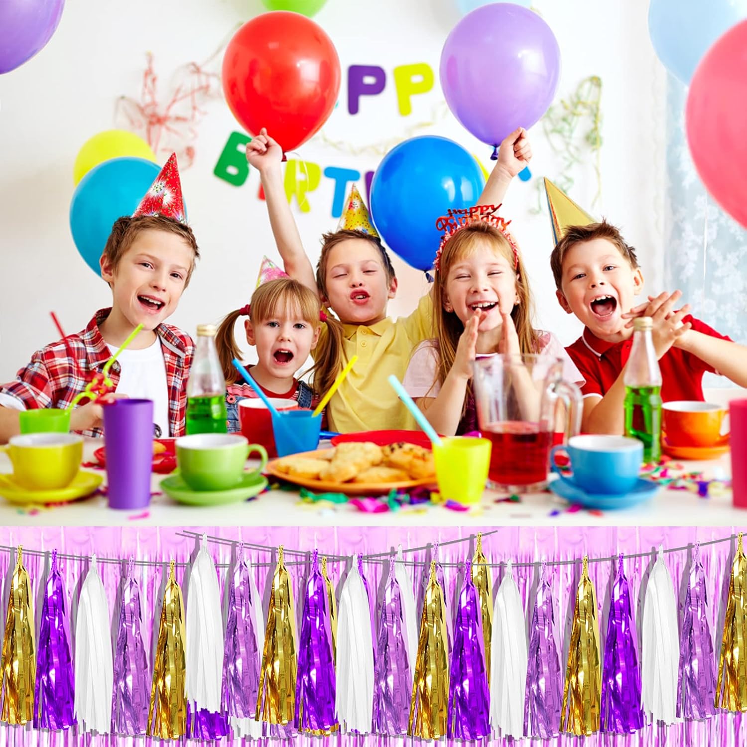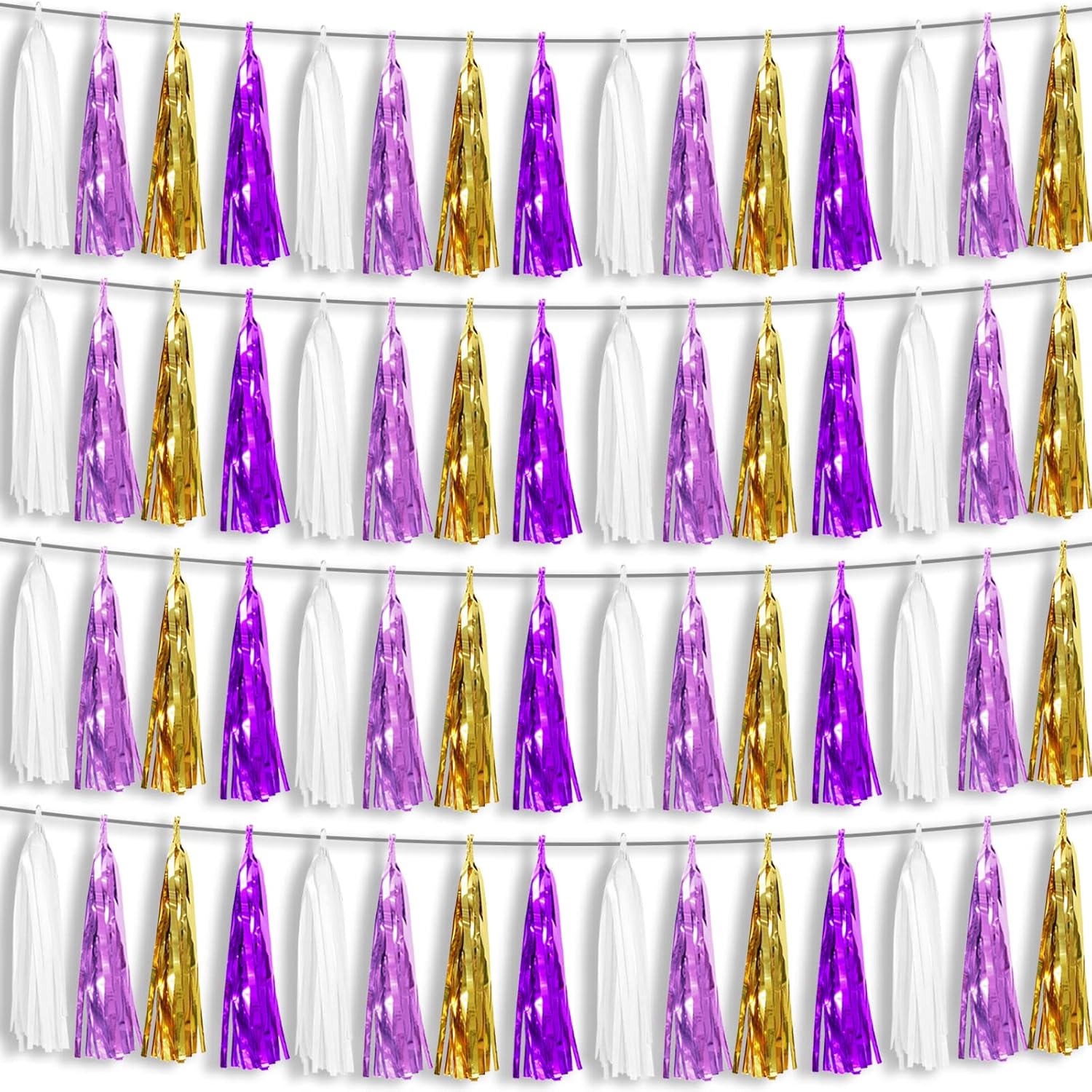 • 【White Light Purple Purple Gold Party Supplies Set】: The total length of the white light purple purple gold birthday tassels banner is 26.2 feet, divided into 4 strips, each 6.5 feet long. Each banner contains 15 tassels, and each tassel measures 14 inches, for birthday decorations many occasions, and so on