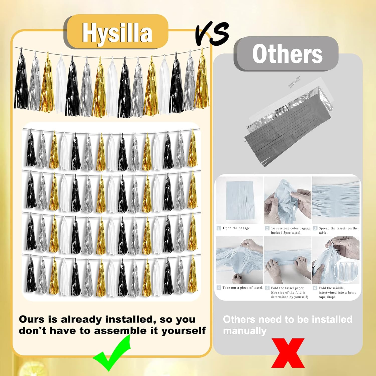 • 【Black Silver Gold White Party Supplies Set】: The total length of the Black Silver Gold White birthday tassels banner is 26.2 feet, divided into 4 strips, each 6.5 feet long. Each banner contains 15 tassels, and each tassel measures 14 inches, for birthday decorations many occasions, and so on
