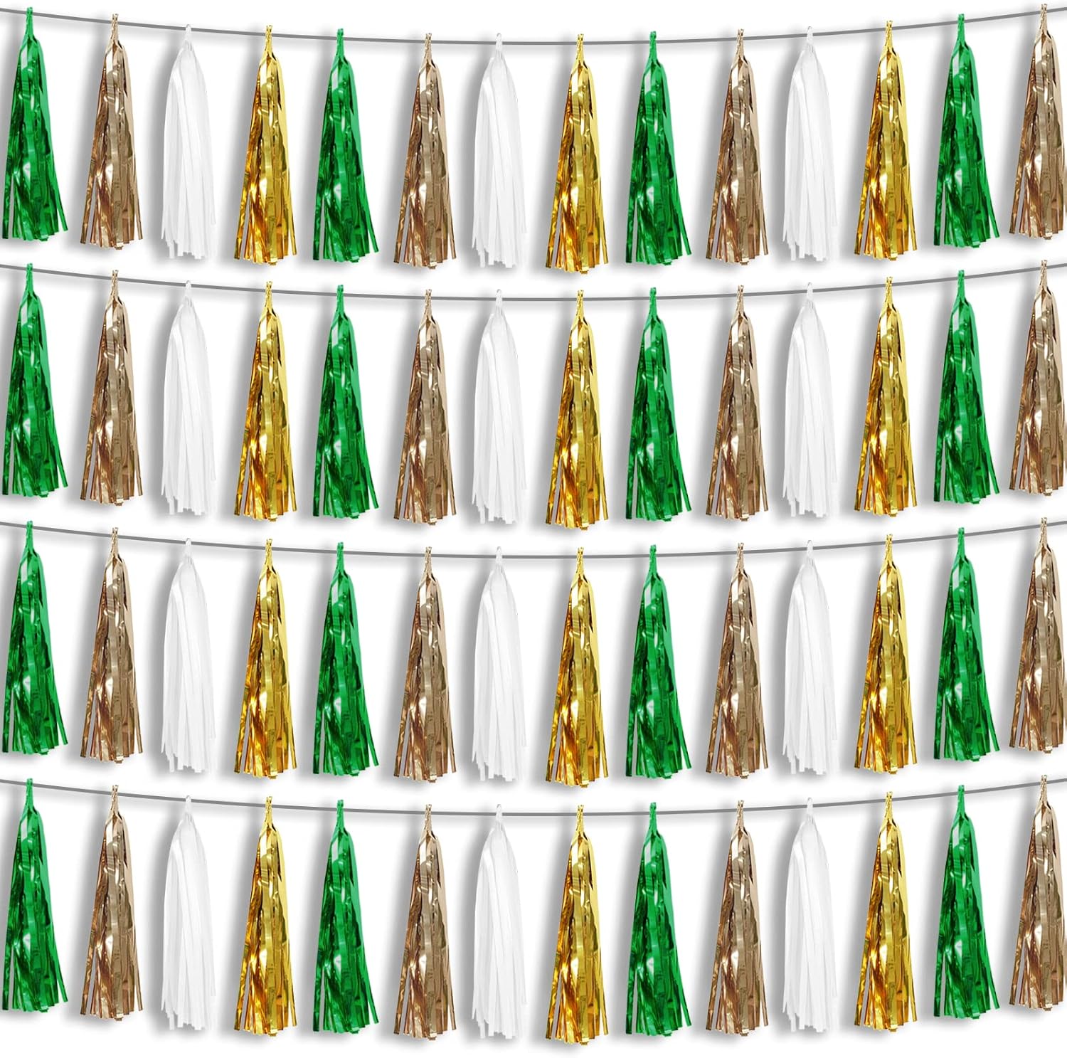 4P Sage-Green Beige-Mint Gold Foil Fringe Metallic Tassel Garland Banner, Tassels Banner Streamers for Parade Floats, Bachelorette, Wedding, Birthday, Christmas, Bridal/Baby Shower Party Decorations