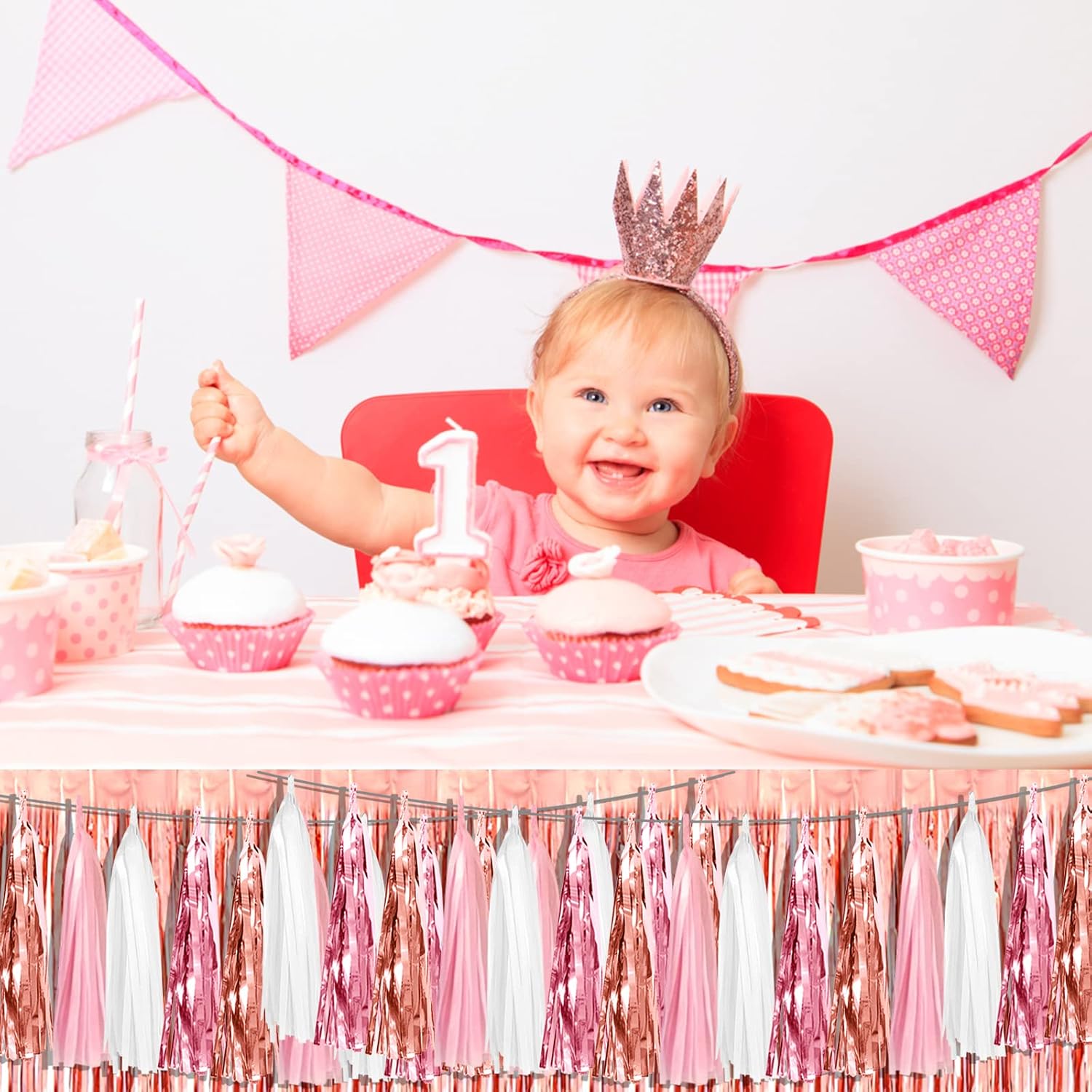 • 【Pink White Peach Rose Gold Party Supplies Set】: The total length of the pink white peach rose gold birthday tassels banner is 26.2 feet, divided into 4 strips, each 6.5 feet long. Each banner contains 15 tassels, and each tassel measures 14 inches, for birthday decorations many occasions, and so on