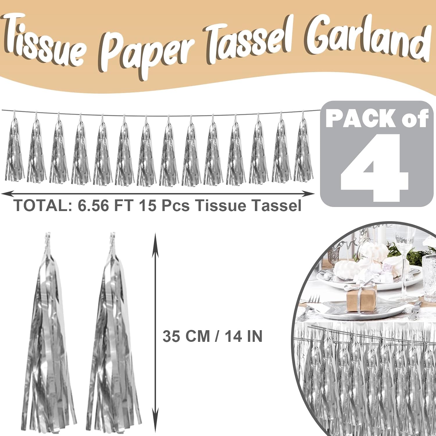 4P Silver Foil Fringe Metallic Tassel Streamers Banner Tassel Garland for Parade Floats, Bachelorette, Wedding, Birthday, Halloween, Christmas, Bridal/Baby Shower Party Decorations