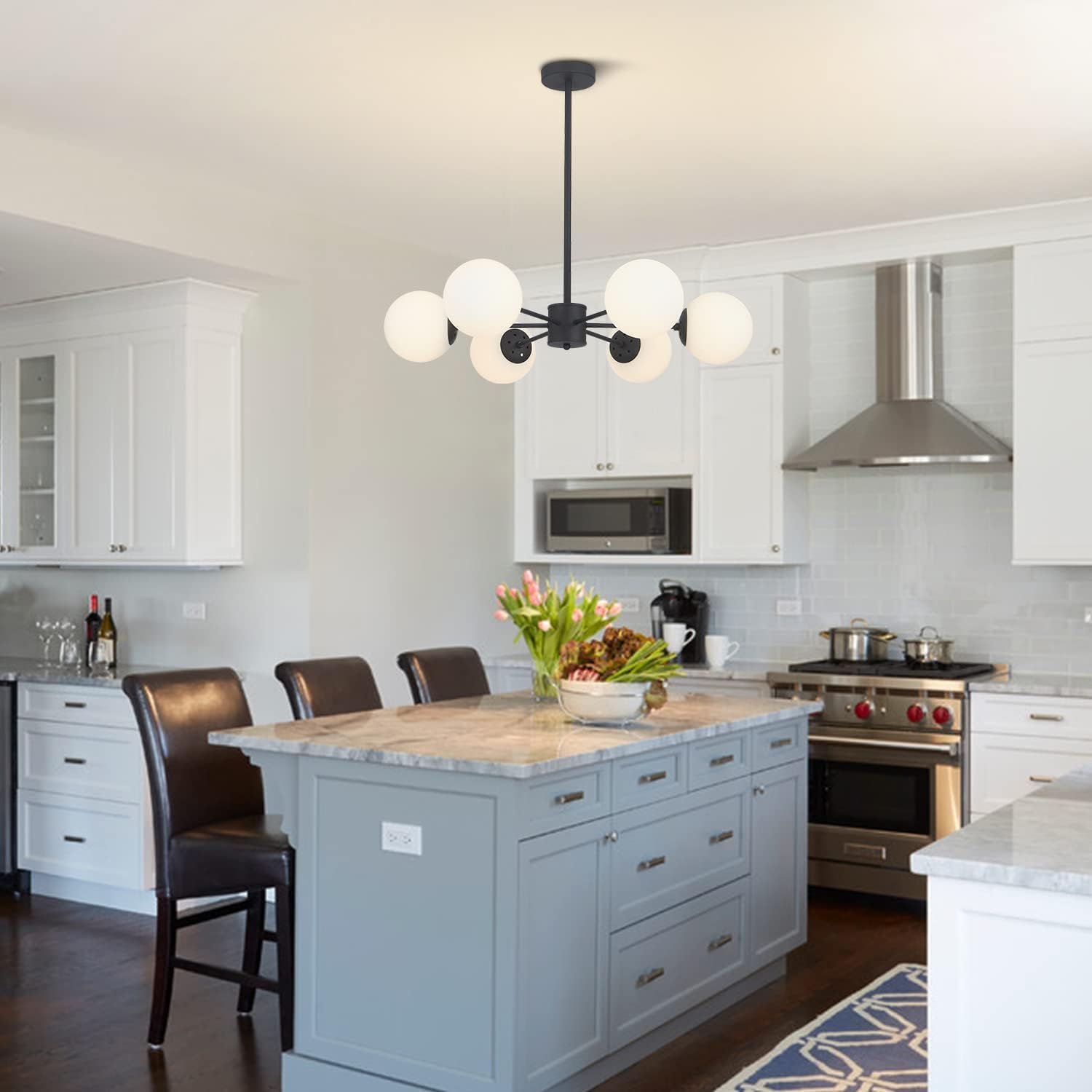 KCO Lighting Matte Black Sputnik Chandelier Light Fixture Mid Century 6-Light Milk Glass Ball Chandelier Modern Globe Flush Mount Ceiling Light Kitchen Island Dining Lighting Fixture (Black+White)