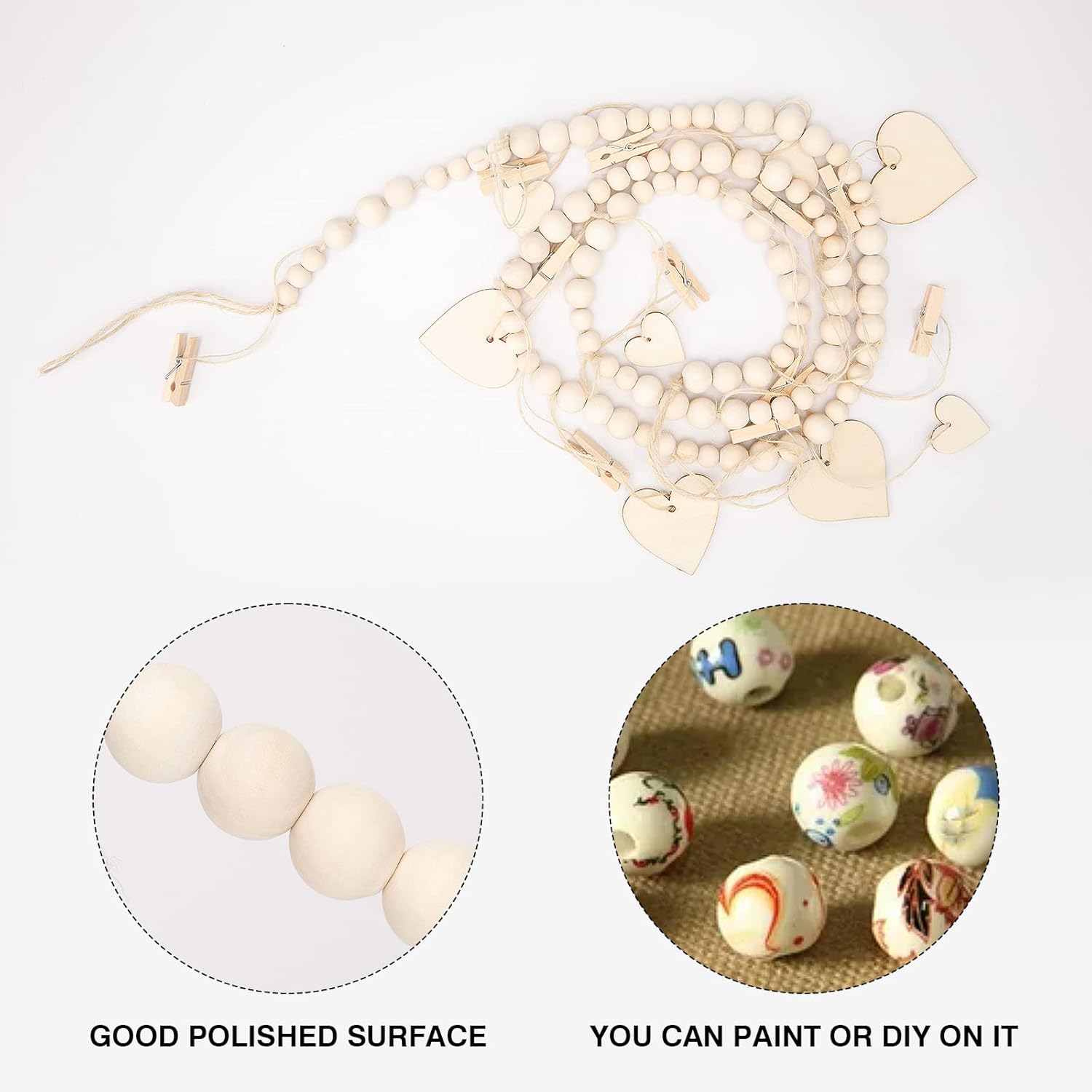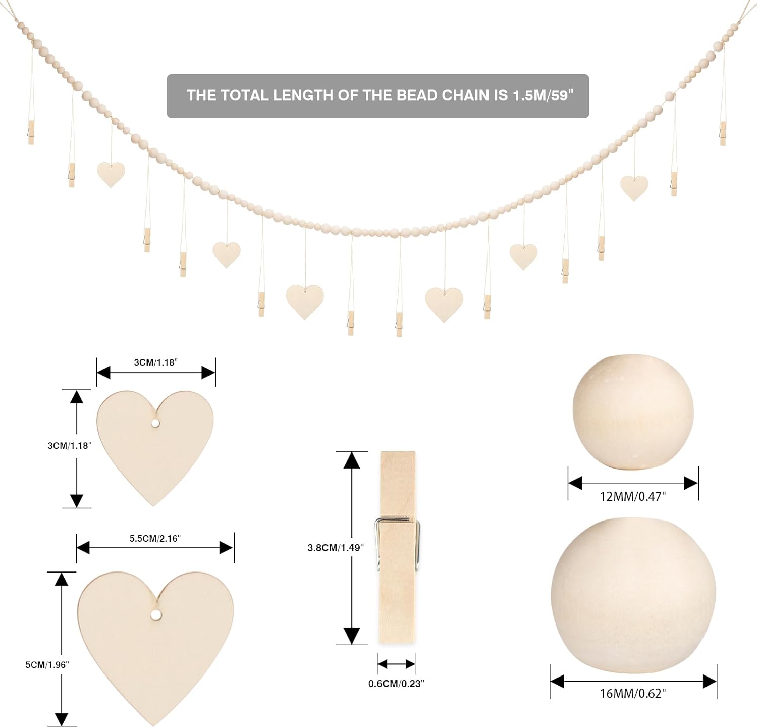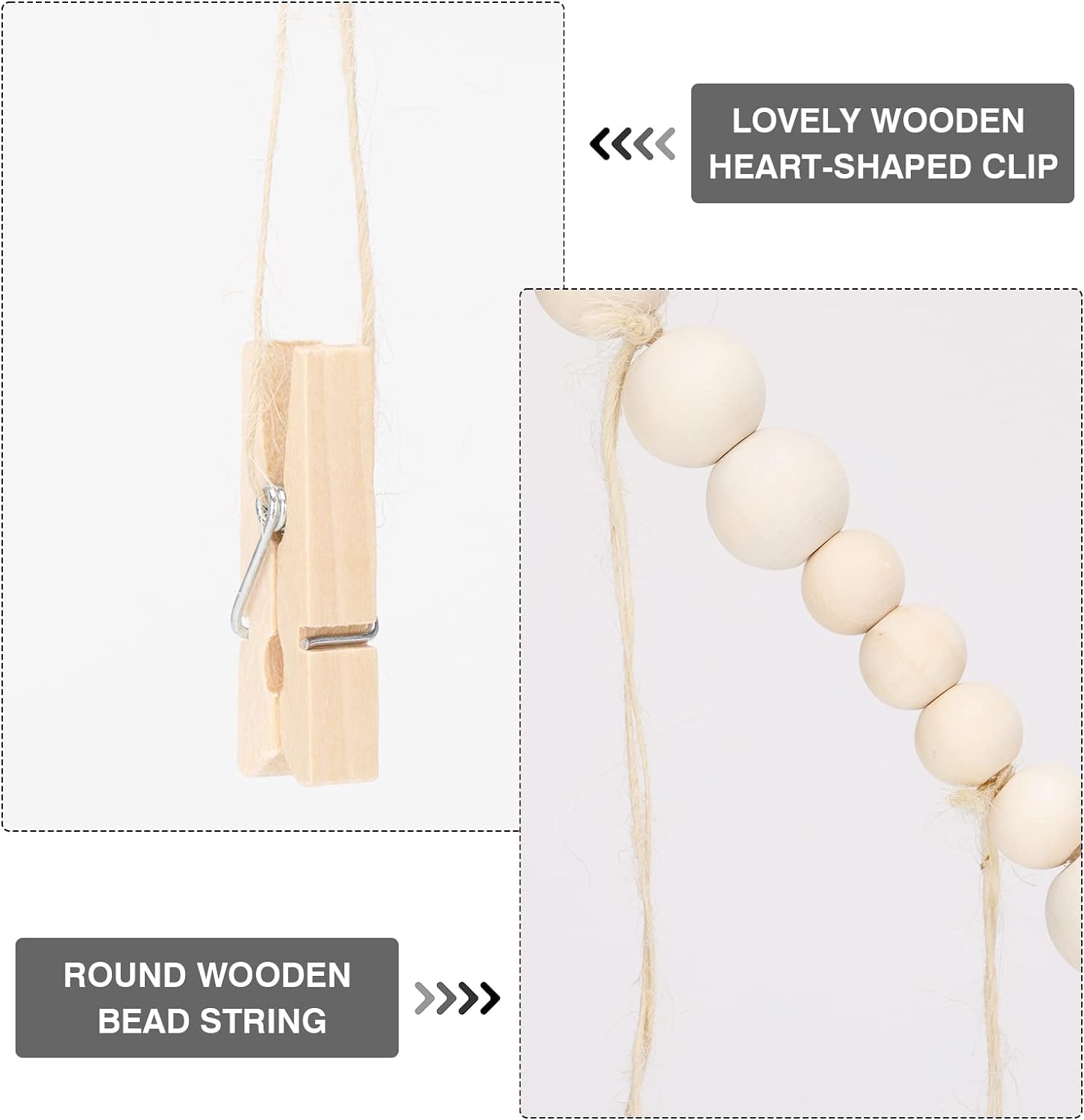 • [Lovely Photo Display Holder] - Our photo display holder is made of white rounded wooden beads as the main body, durable and sturdy jute rope for stringing, wooden solid wood clips to hold the photos for display, and 6 wooden heart-shaped hanging tags for a very cute accent. Round wooden beads and wooden heart-shaped tags can be painted or written messages!